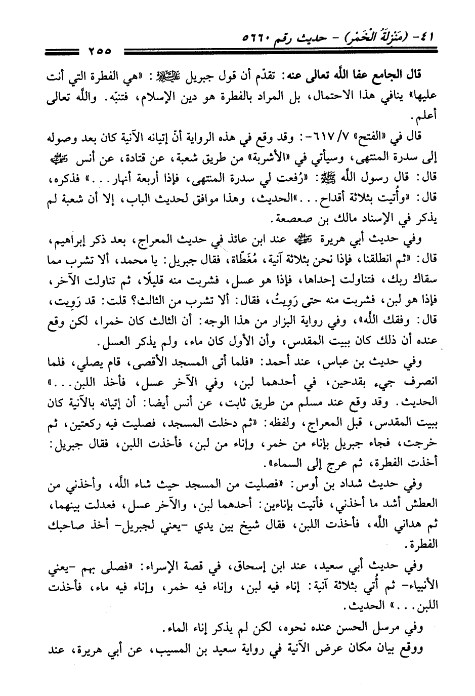 وفي حديث بن عبّاس، عند أحمد: "فلما أتى المسجد الأقصى، قام يصلي، فلما انصرف جيء بقدحين، فِي أحدهما لبن، وفي الآخر عسل، فأخذ اللبن ... " الْحَدِيث. وَقَدْ وقع عند مسلم منْ طريق ثابت، عن أنس أيضاً: أن إتيانه بالآنية كَانَ ببيت المقدس، قبل المعراج، ولفظه: "ثم دخلت المسجد، فصليت فيه ركعتين، ثم خرجت، فجاء جبريل بإناء منْ خمر، دهاناء منْ لبن، فأخذت اللبن، فَقَالَ جبريل: أخذت الفطرة، ثم عرج إلى السماء".