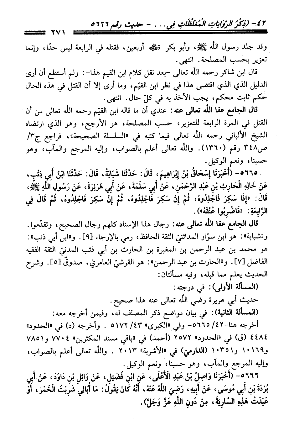 قَالَ الجامع عفا الله تعالى عنه: عندي أن ما قاله ابن القيّم رحمه الله تعالى منْ أن القتل فِي المرة الرابعة للتعزير، حسب المصلحة، هو الأرجح، وهو الذي ارتضاه الشيح الألباني رحمه الله تعالى فيما كتبه فِي "السلسلة الصحيحة"، فراجع جـ 3/ ص 348 رقم (1360). والله تعالى أعلم بالصواب، وإليه المرجع والمآب، وهو حسبنا، ونعم الوكيل.