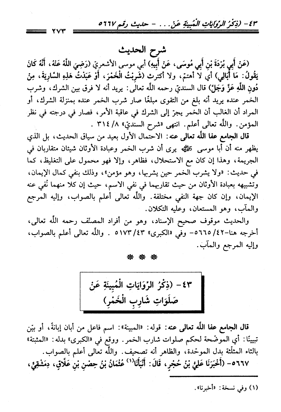 قَالَ الجامع عفا الله تعالى عنه: قوله: "المبينة": اسم فاعل منْ أبان إبانةً، أو بيّن تبيينًا: أي الموضّحة لحكم صلوات شارب الخمر. ووقع فِي "الكبرى" بدله: "المثبتة" بالثاء المثلّثة بدل الموحّدة، والظاهر أنه تصحيف. والله تعالى أعلم بالصواب.
