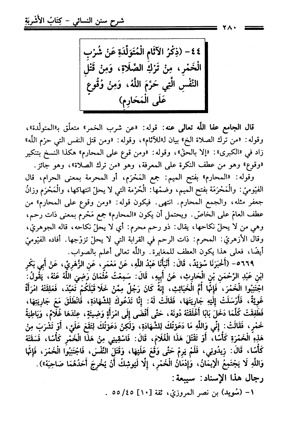 5669 - (أَخْبَرَنَا سُوَيْدٌ، قَالَ: أَنْبَأَنَا عَبْدُ اللَّهِ، عَنْ مَعْمَرٍ، عَنِ الزُّهْرِيِّ، عَنْ أَبِي بَكْرِ بْنِ عَبْدِ الرَّحْمَنِ بْنِ الْحَارِثِ، عَنْ أَبِيهِ، قَالَ: سَمِعْتُ عُثْمَانَ رضى الله عنه، يَقُولُ: اجْتَنِبُوا الْخَمْرَ، فَإِنَّهَا أُمُّ الْخَبَائِثِ، إِنَّهُ كَانَ رَجُلٌ مِمَّنْ خَلاَ قَبْلَكُمْ تَعَبَّدَ، فَعَلِقَتْهُ امْرَأَةٌ غَوِيَّةٌ، فَأَرْسَلَتْ إِلَيْهِ جَارِيَتَهَا، فَقَالَتْ لَهُ: إِنَّا نَدْعُوكَ لِلشَّهَادَةِ، فَانْطَلَقَ مَعَ جَارِيَتِهَا، فَطَفِقَتْ كُلَّمَا دَخَلَ بَابًا أَغْلَقَتْهُ دُونَهُ، حَتَّى أَفْضَى إِلَى امْرَأَةٍ وَضِيئَةٍ، عِنْدَهَا غُلاَمٌ، وَبَاطِيَةُ خَمْرٍ، فَقَالَتْ: إِنِّي وَاللَّهِ مَا دَعَوْتُكَ لِلشَّهَادَةِ، وَلَكِنْ دَعَوْتُكَ لِتَقَعَ عَلَيَّ، أَوْ تَشْرَبَ مِنْ هَذِهِ الْخَمْرَةِ كَأْسًا، أَوْ تَقْتُلَ هَذَا الْغُلاَمَ، قَالَ: فَاسْقِينِي مِنْ هَذَا الْخَمْرِ كَأْسًا، فَسَقَتْهُ كَأْسًا، قَالَ: زِيدُونِي، فَلَمْ يَرِمْ حَتَّى وَقَعَ عَلَيْهَا، وَقَتَلَ النَّفْسَ، فَاجْتَنِبُوا الْخَمْرَ، فَإِنَّهَا وَاللَّهِ لاَ يَجْتَمِعُ الإِيمَانُ، وَإِدْمَانُ الْخَمْرِ، إِلاَّ لَيُوشِكُ أَنْ يُخْرِجَ أَحَدُهُمَا صَاحِبَهُ").