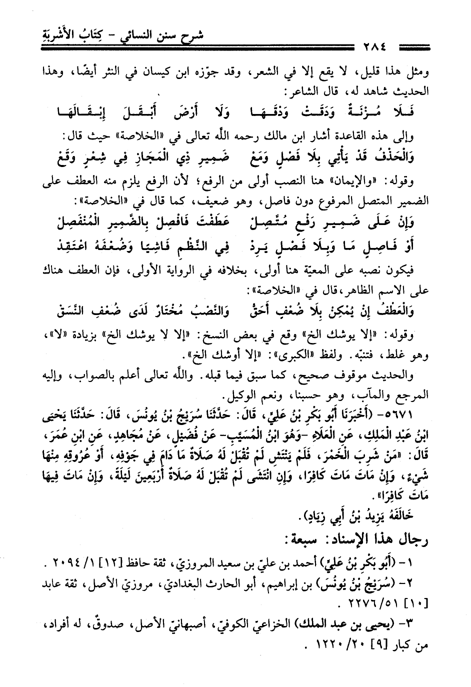 5671 - (أَخْبَرَنَا أَبُو بَكْرِ بْنُ عَلِيٍّ، قَالَ: حَدَّثَنَا سُرَيْجُ بْنُ يُونُسَ، قَالَ: حَدَّثَنَا يَحْيَى بْنُ عَبْدِ الْمَلِكِ، عَنِ الْعَلاَءِ -وَهُوَ ابْنُ الْمُسَيَّبِ- عَنْ فُضَيْلٍ، عَنْ مُجَاهِدٍ، عَنِ ابْنِ عُمَرَ، قَالَ: "مَنْ شَرِبَ الْخَمْرَ، فَلَمْ يَنْتَشِ لَمْ تُقْبَلْ لَهُ صَلاَةٌ مَادَامَ فِي جَوْفِهِ، أَوْ عُرُوقِهِ مِنْهَا شَيْءٌ، وَإِنْ مَاتَ مَاتَ كَافِرًا، وَإِنِ انْتَشَى لَمْ تُقْبَلْ لَهُ صَلاَةٌ أَرْبَعِينَ لَيْلَةً، وَإِنْ مَاتَ فِيهَا مَاتَ كَافِرًا".