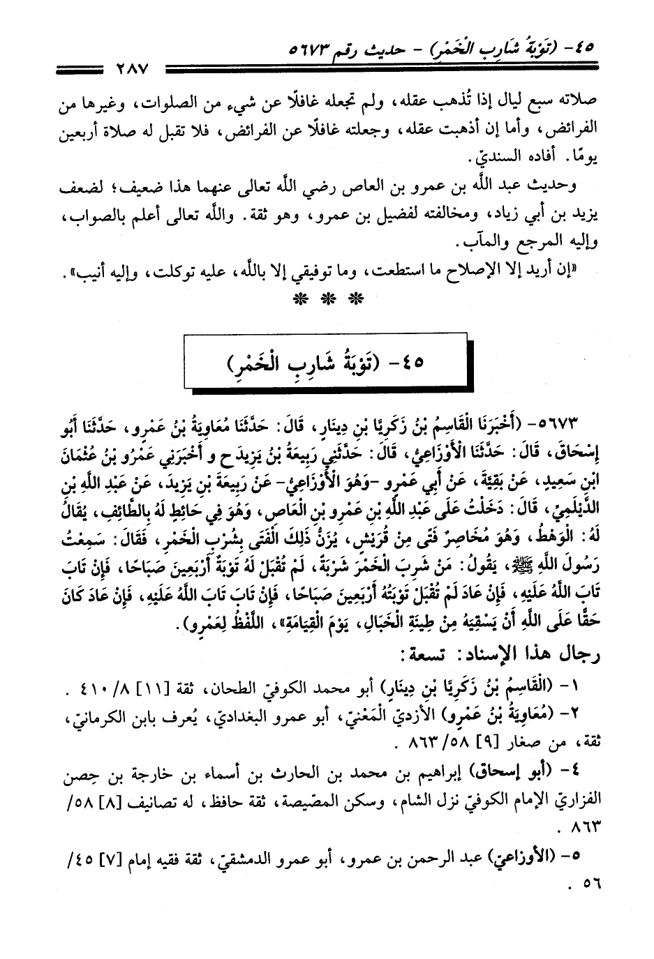 5673 - (أَخْبَرَنَا الْقَاسِمُ بْنُ زَكَرِيَّا بْنِ دِينَارٍ، قَالَ: حَدَّثَنَا مُعَاوِيَةُ بْنُ عَمْرٍو، حَدَّثَنَا أَبُو إِسْحَاقَ، قَالَ: حَدَّثَنَا الأَوْزَاعِيُّ، قَالَ: حَدَّثَنِي رَبِيعَةُ بْنُ يَزِيدَ ح وَأَخْبَرَنِي عَمْرُو بْنُ عُثْمَانَ بْنِ سَعِيدٍ، عَنْ بَقِيَّةَ، عَنْ أَبِي عَمْرٍو -وَهُوَ الأَوْزَاعِيُّ- عَنْ رَبِيعَةَ بْنِ يَزِيدَ، عَنْ عَبْدِ اللَّهِ بْنِ الدَّيْلَمِيِّ، قَالَ: دَخَلْتُ عَلَى عَبْدِ اللَّهِ بْنِ عَمْرِو بْنِ الْعَاصِ، وَهُوَ فِي حَائِطٍ لَهُ بِالطَّائِفِ، يُقَالُ لَهُ: الْوَهْطُ، وَهُوَ مُخَاصِرٌ فَتًى مِنْ قُرَيْشٍ، يُزَنُّ ذَلِكَ الْفَتَى بِشُرْبِ الْخَمْرِ، فَقَالَ: سَمِعْتُ رَسُولَ اللَّهِ -صلى الله عليه وسلم-، يَقُولُ: "مَنْ شَرِبَ الْخَمْرَ شَرْبَةً، لَمْ تُقْبَلْ لَهُ تَوْبَةٌ أَرْبَعِينَ صَبَاحًا، فَإِنْ تَابَ تَابَ اللَّهُ عَلَيْهِ، فَإِنْ عَادَ لَمْ تُقْبَلْ تَوْبَتُهُ أَرْبَعِينَ صَبَاحًا، فَإِنْ تَابَ تَابَ اللَّهُ عَلَيْهِ، فَإِنْ عَادَ كَانَ حَقًّا عَلَى اللَّهِ أَنْ يَسْقِيَهُ مِنْ طِينَةِ الْخَبَالِ، يَوْمَ الْقِيَامَةِ". اللَّفْظُ لِعَمْرٍو).
