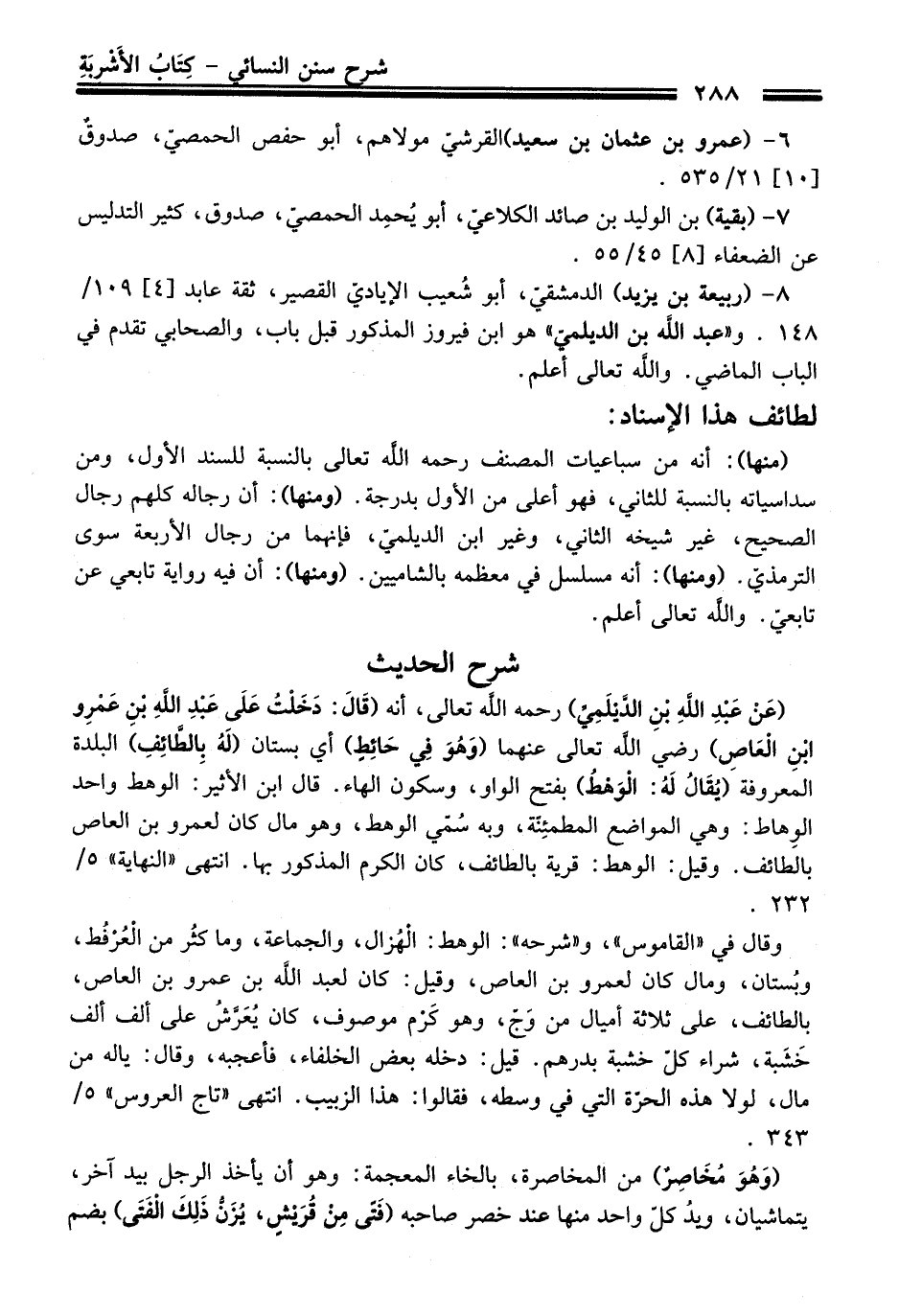 (عَنْ عَبْدِ اللهِ بْنِ الدَّيْلَميِّ) رحمه الله تعالى، أنه (قَالَ: دَخَلْتُ عَلَى عَبْدِ اللهِ بْنِ عَمْرِو ابْنِ الْعَاصِ) رضي الله تعالى عنهما (وَهُوَ فِي حَائِطٍ) أي بستان (لَهُ بِالطَّائِفِ) البلدة المعروفة (يُقَالُ لَهُ: الْوَهْطُ) بفتح الواو، وسكون الهاء. قَالَ ابن الأثير: الوهط واحد الوِهاط: وهي المواضع المطمئِنة، وبه سُمّي الوهط، وهو مال كَانَ لعمرو بن العاص بالطائف. وقيل: الوهط: قرية بالطائف، كَانَ الكرم المذكور بها. انتهى "النهاية" 5/ 232.