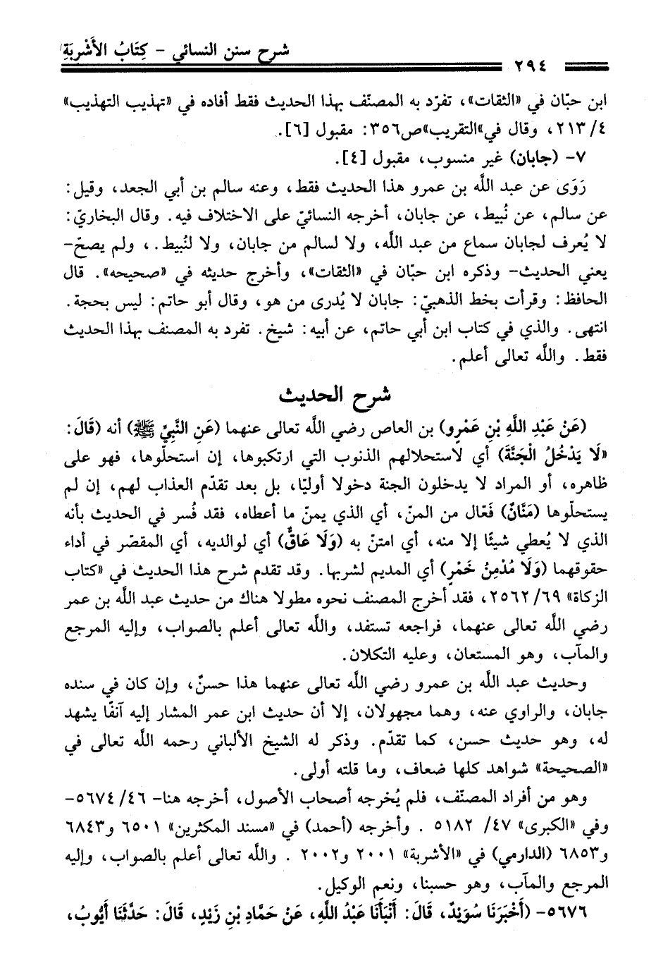 (عَنْ عَبْدِ اللهِ بْنِ عَمْرٍو) بن العاص رضي الله تعالى عنهما (عَنِ النَّبِيِّ -صلى الله عليه وسلم-) أنه (قَالَ: "لَا يَدْخُلُ الْجَنَّةَ) أي لاستحلالهم الذنوب التي ارتكبوها، إن استحلّوها، فهو عَلَى ظاهره، أو المراد لا يدخلون الجنة دخولا أوليًا، بل بعد تقدّم العذاب لهم، إن لم يستحلّوها (مَنَّانٌ) فَعّال منْ المنّ، أي الذي يمتنّ ما أعطاه، فقد فُسر فِي الْحَدِيث بأنه الذي لا يُعطي شيئًا إلا منه، أي امتنّ به (وَلَا عَاقُّ) أي لوالديه، أي المقصّر فِي أداء حقوقهما (وَلَا مُدْمِنُ خَمْرٍ) أي المديم لشربها. وَقَدْ تقدّم شرح هَذَا الْحَدِيث فِي "كتاب الزكاة" 69/ 2562، فقد أخرج المصنّف نحوه مطولاً هناك منْ حديث عبد الله بن عمر رضي الله تعالى عنهما، فراجعه تستفد، والله تعالى أعلم بالصواب، وإليه المرجع والمآب، وهو المستعان، وعليه التكلان.