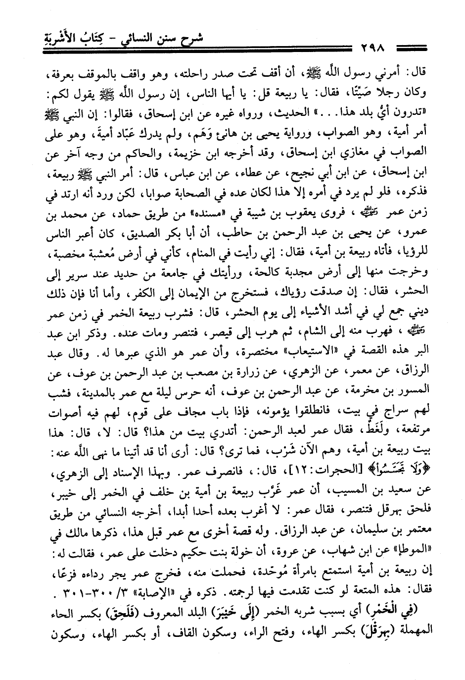 قَالَ: أمرني رسول الله -صلى الله عليه وسلم-، أن أقف تحت صدر راحلته، وهو واقف بالموقف بعرفة، وكان رجلاً صَيِّتًا، فَقَالَ: يا ربيعة قل: يا أيها النَّاس، إن رسول الله -صلى الله عليه وسلم- يقول لكم: "تدرون أيُّ بلد هَذَا ... " الْحَدِيث، ورواه غيره عن ابن إسحاق، فقالوا: إن النبي -صلى الله عليه وسلم- أمر أمية، وهو الصواب، ورواية يحيى بن هانىء وَهَم، ولم يدرك عَبّاد أميةَ، وهو عَلَى الصواب فِي مغازي ابن إسحاق، وَقَدْ أخرجه ابن خزيمة، والحاكم منْ وجه آخر عن ابن إسحاق، عن ابن أبي نجيح، عن عطاء، عن ابن عبّاس، قَالَ: أمر النبيّ -صلى الله عليه وسلم- ربيعة، فذكره، فلو لم يرد فِي أمره إلا هَذَا لكان عده فِي الصحابة صوابا، لكن ورد أنه ارتد فِي زمن عمر -رضي الله عنه-، فروى يعقوب بن شيبة فِي "مسنده" منْ طريق حماد، عن محمد بن عمرو، عن يحيى بن عبد الرحمن بن حاطب، أن أبا بكر الصديق، كَانَ أعبر النَّاس للرؤيا، فأتاه ربيعة بن أمية، فَقَالَ: إني رأيت فِي المنام، كأني فِي أرض مُعشبة مخصبة، وخرجت منها إلى أرض مجدبة كالحة، ورأيتك فِي جامعة منْ حديد عند سرير إلى الحشر، فَقَالَ: إن صدقت رؤياك، فستخرج منْ الإيمان إلى الكفر، وأما أنا فإن ذلك ديني جمع لي فِي أشد الأشياء إلى يوم الحشر، قَالَ: فشرب ربيعة الخمر فِي زمن عمر -رضي الله عنه-، فهرب منه إلى الشام، ثم هرب إلى قيصر، فتنصر ومات عنده. وذكر ابن عبد البر هذه القصة فِي "الاستيعاب" مختصرة، وأن عمر هو الذي عبرها له. وَقَالَ عبد الرزاق، عن معمر، عن الزهريّ، عن زرارة بن مصعب بن عبد الرحمن بن عوف، عن المسور بن مخرمة، عن عبد الرحمن بن عوف، أنه حرس ليلة مع عمر بالمدينة، فشب لهم سراج فِي بيت، فانطلقوا يؤمونه، فإذا باب مجاف عَلَى قوم، لهم فيه أصوات مرتفعة، ولَغَطٌ، فَقَالَ عمر لعبد الرحمن: أتدري بيت منْ هَذَا؟ قَالَ: لا، قَالَ: هَذَا بيت ربيعة بن أمية، وهم الآن شَرْب، فما ترى؟ قَالَ: أرى أنا قد أتينا ما نهى الله عنه. {وَلَا تَجَسَّسُوا} [الحجرات: 12] قَالَ: فانصرف عمر. وبهذا الإسناد إلى الزهريّ، عن سعيد بن المسيب، أن عمر غَرَّب ربيعة بن أمية بن خلف فِي الخمر إلى خيبر، فلحق بهرقل فتنصر، فَقَالَ عمر: لا أغرب بعده أحدا أبدا، أخرجه النسائيّ منْ طريق معتمر بن سليمان، عن عبد الرزاق. وله قصة أخرى مع عمر قبل هَذَا، ذكرها مالك فِي "الموطإ" عن ابن شهاب، عن عروة، أن خولة بنت حكيم دخلت عَلَى عمر، فقالت له: إن ربيعة بن أمية استمتع بامرأة مُوحّدة، فحملت منه، فخرج عمر يجر رداءه فزعًا، فَقَالَ: هذه المتعة لو كنت تقدمت فيها لرجمته. ذكره فِي "الإصابة" 3/ 300 - 301.