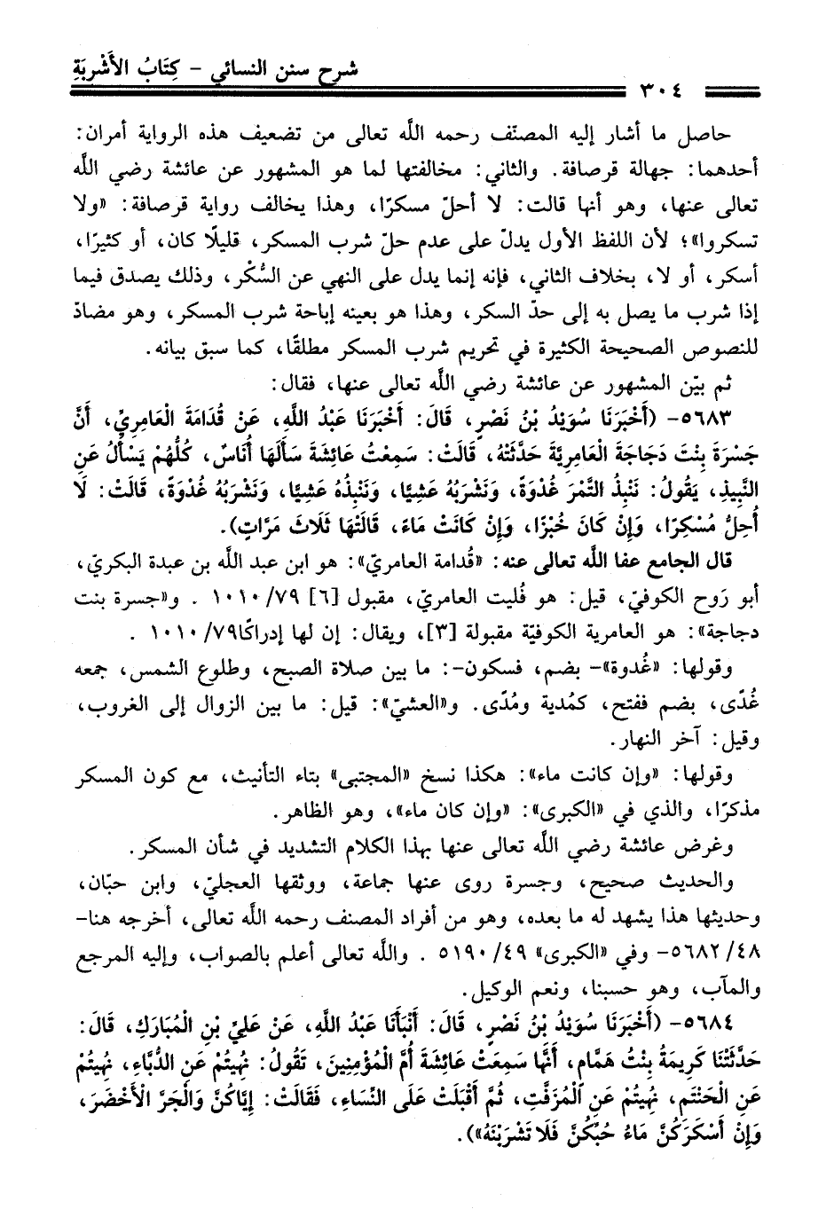 5683 - (أَخْبَرَنَا سُوَيْدُ بْنُ نَصْرٍ، قَالَ: أَخْبَرَنَا عَبْدُ اللَّهِ، عَنْ قُدَامَةَ الْعَامِرِيِّ، أَنَّ جَسْرَةَ بِنْتَ دَجَاجَةَ الْعَامِرِيَّةَ حَدَّثَتْهُ، قَالَتْ: سَمِعْتُ عَائِشَةَ سَأَلَهَا أُنَاسٌ، كُلُّهُمْ يَسْأَلُ عَنِ النَّبِيذِ، يَقُولُ: نَنْبِذُ التَّمْرَ غُدْوَةً، وَنَشْرَبُهُ عَشِيًّا، وَنَنْبِذُهُ عَشِيًّا، وَنَشْرَبُهُ غُدْوَةً، قَالَتْ: لاَ أُحِلُّ مُسْكِرًا، وَإِنْ كَانَ خُبْزًا، وَإِنْ كَانَتْ مَاءً، قَالَتْهَا ثَلاَثَ مَرَّاتٍ).