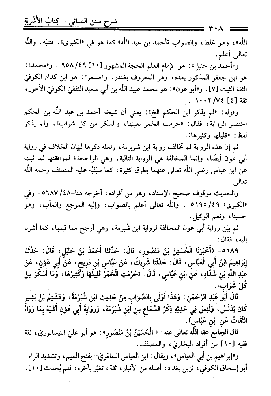 5689 - (أَخْبَرَنَا الْحُسَيْنُ بْنُ مَنْصُورٍ، قَالَ: حَدَّثَنَا أَحْمَدُ بْنُ حَنْبَلٍ، قَالَ: حَدَّثَنَا إِبْرَاهِيمُ بْنُ أَبِي الْعَبَّاسِ، قَالَ: حَدَّثَنَا شَرِيكٌ، عَنْ عَبَّاسِ بْنِ ذَرِيحٍ، عَنْ أَبِي عَوْنٍ، عَنْ عَبْدِ اللَّهِ بْنِ شَدَّادٍ، عَنِ ابْنِ عَبَّاسٍ، قَالَ: "حُرِّمَتِ الْخَمْرُ قَلِيلُهَا وَكَثِيرُهَا، وَمَا أَسْكَرَ مِنْ كُلِّ شَرَابٍ".