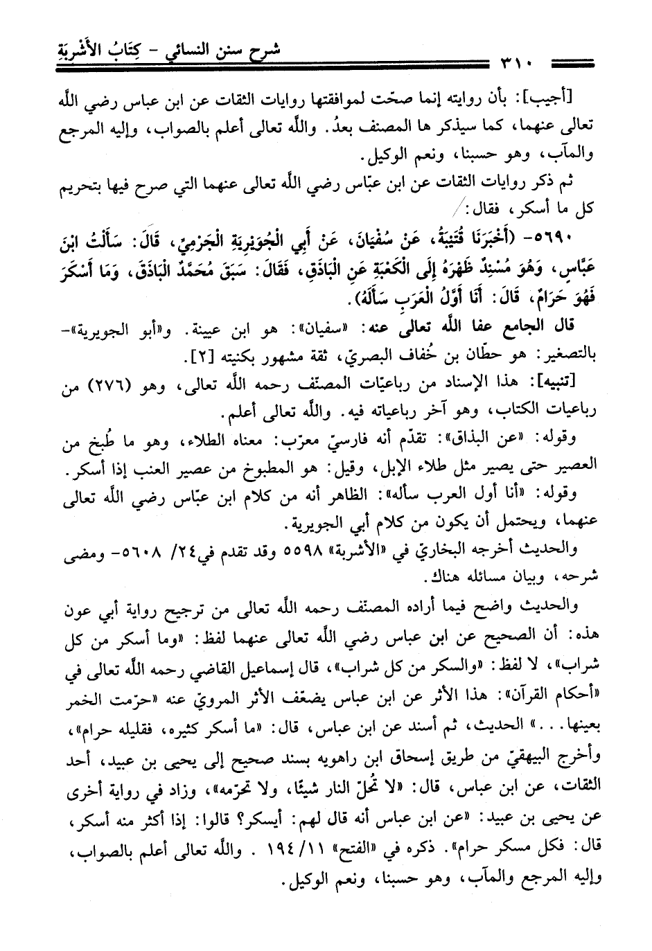 5690 - (أَخْبَرَنَا قُتَيْبَةُ، عَنْ سُفْيَانَ، عَنْ أَبِي الْجُوَيْرِيَةِ الْجَرْمِيِّ، قَالَ: سَأَلْتُ ابْنَ عَبَّاسٍ، وَهُوَ مُسْنِدٌ ظَهْرَهُ إِلَى الْكَعْبَةِ عَنِ الْبَاذَقِ، فَقَالَ: سَبَقَ مُحَمَّدٌ الْبَاذَقَ، وَمَا أَسْكَرَ فَهُوَ حَرَامٌ، قَالَ: أَنَا أَوَّلُ الْعَرَبِ سَأَلَهُ).