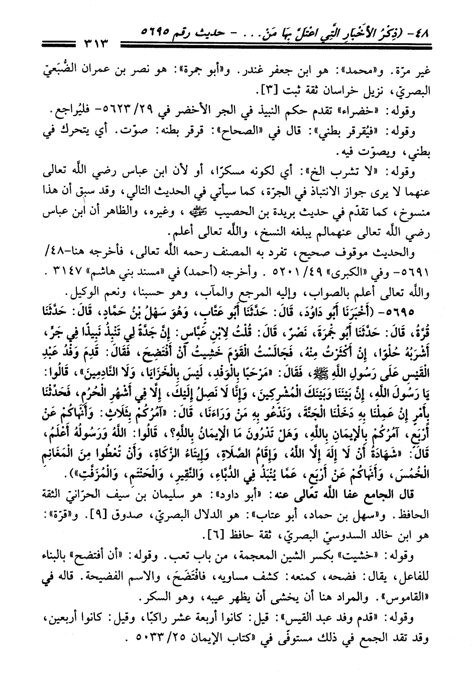 5695 - (أَخْبَرَنَا أَبُو دَاوُدَ، قَالَ: حَدَّثَنَا أَبُو عَتَّابٍ، وَهُوَ سَهْلُ بْنُ حَمَّادٍ، قَالَ: حَدَّثَنَا قُرَّةُ، قَالَ: حَدَّثَنَا أَبُو جَمْرَةَ، نَصْرٌ، قَالَ: قُلْتُ لاِبْنِ عَبَّاسٍ: إِنَّ جَدَّةً لِي تَنْبِذُ نَبِيذًا فِي جَرٍّ، أَشْرَبُهُ حُلْوًا، إِنْ أَكْثَرْتُ مِنْهُ، فَجَالَسْتُ الْقَوْمَ خَشِيتُ أَنْ أَفْتَضِحَ، فَقَالَ: قَدِمَ وَفْدُ عَبْدِ الْقَيْسِ عَلَى رَسُولِ اللَّهِ -صلى الله عليه وسلم-، فَقَالَ: "مَرْحَبًا بِالْوَفْدِ، لَيْسَ بِالْخَزَايَا، وَلاَ النَّادِمِينَ"، قَالُوا: يَا رَسُولَ اللَّهِ، إِنَّ بَيْنَنَا وَبَيْنَكَ الْمُشْرِكِينَ، وَإِنَّا لاَ نَصِلُ إِلَيْكَ، إِلاَّ فِي أَشْهُرِ الْحُرُمِ، فَحَدِّثْنَا بِأَمْرٍ إِنْ عَمِلْنَا بِهِ دَخَلْنَا الْجَنَّةَ، وَنَدْعُو بِهِ مَنْ وَرَاءَنَا، قَالَ: "آمُرُكُمْ بِثَلاَثٍ: وَأَنْهَاكُمْ عَنْ أَرْبَعٍ، آمُرُكُمْ بِالإِيمَانِ بِاللَّهِ، وَهَلْ تَدْرُونَ مَا الإِيمَانُ بِاللَّهِ؟ "، قَالُوا: اللَّهُ وَرَسُولُهُ أَعْلَمُ، قَالَ: "شَهَادَةُ أَنْ لاَ إِلَهَ إِلاَّ اللَّهُ، وَإِقَامُ الصَّلاَةِ، وَإِيتَاءُ الزَّكَاةِ، وَأَنْ تُعْطُوا مِنَ الْمَغَانِمِ الْخُمُسَ، وَأَنْهَاكُمْ عَنْ أَرْبَعٍ، عَمَّا يُنْبَذُ فِي الدُّبَّاءِ، وَالنَّقِيرِ، وَالْحَنْتَمِ، وَالْمُزَفَّتِ").