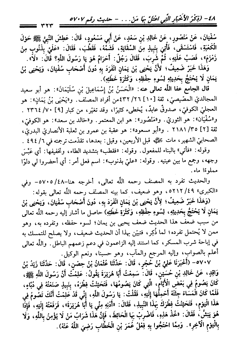 (وَهَذَا خَبَرٌ ضَعِيفٌ؛ لِأَنَّ يَحْيَى بْنَ يَمَانٍ انْفَرَدَ بِهِ، دُونَ أَصْحَابِ سُفْيَانَ، وَيَحْيَى بْنُ يَمَانٍ لَا يُحْتَجُّ بِحَدِيثِهِ، لِسُوءِ حِفْظِهِ، وَكَثْرَةِ خَطَئِهِ) حاصل ما أشار إليه رحمه الله تعالى منْ سبب ضعف هَذَا الْحَدِيث ضعف يحيى بن يمان؛ لسوء حفظه، وتفرده به، وهو ممن لا يُحتمل تفرده؛ لما ذُكِر، فتبيّن بهذا أن الْحَدِيث ضعيف، ولا يصلح للتمسك به فِي إباحة شرب المسكر، كما استند إليه الزاعمون فِي دعم زعمهم الباطل. والله تعالى أعلم بالصواب، وإليه المرجع والمآب، وهو حسبنا، ونعم الوكيل.