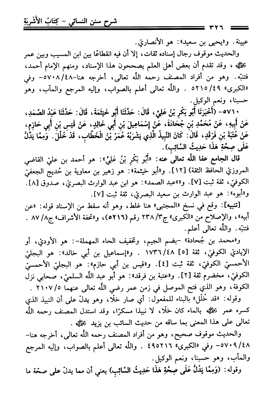 5710 - (أَخْبَرَنَا أَبُو بَكْرِ بْنُ عَلِيٍّ، قَالَ: حَدَّثَنَا أَبُو خَيْثَمَةَ، قَالَ: حَدَّثَنَا عَبْدُ الصَّمَدِ، عَنْ أَبِيهِ، عَنْ مُحَمَّدِ بْنِ جُحَادَةَ، عَنْ إِسْمَاعِيلَ بْنِ أَبِي خَالِدٍ، عَنْ قَيْسِ بْنِ أَبِي حَازِمٍ، عَنْ عُتْبَةَ بْنِ فَرْقَدٍ، قَالَ: كَانَ النَّبِيذُ الَّذِي يَشْرَبُهُ عُمَرُ بْنُ الْخَطَّابِ، قَدْ خُلِّلَ. وَمِمَّا يَدُلُّ عَلَى صِحَّةِ هَذَا حَدِيثُ السَّائِبِ).