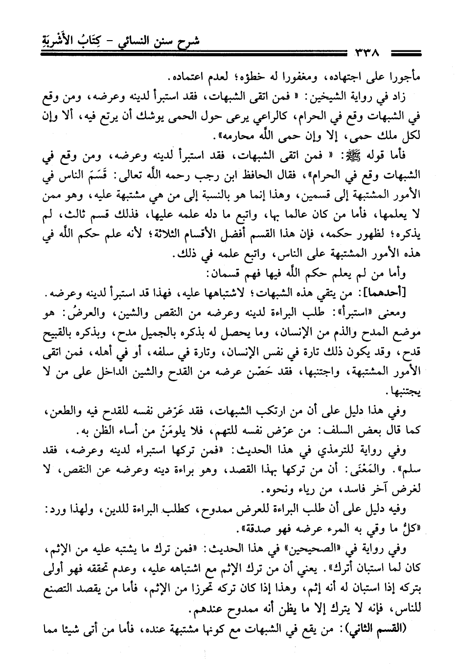 فأما قوله -صلى الله عليه وسلم-: "فمن اتقى الشبهات، فقد استبرأ لدينه وعرضه، ومن وقع فِي الشبهات وقع فِي الحرام"، فَقَالَ الحافظ ابن رَجَب رحمه الله تعالى: قَسَمَ النَّاس فِي الأمور المشتبهة إلى قسمين، وهذا إنما هو بالنسبة إلى منْ هي مشتبهة عليه، وهو ممن لا يعلمها، فأما منْ كَانَ عالما بها، واتبع ما دله علمه عليها، فذلك قسم ثالث، لم يذكره؛ لظهور حكمه، فإن هَذَا القسم أفضل الأقسام الثلاثة؛ لأنه علم حكم الله فِي هذه الأمور المشتبهة عَلَى النَّاس، واتبع علمه فِي ذلك.