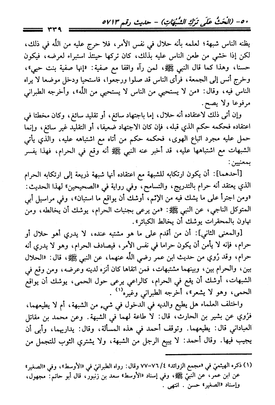 [والمعنى الثاني]: أن منْ أقدم عَلَى ما هو مشتبه عنده، لا يدري أهو حلال أو حرام، فإنه لا يأمن أن يكون حراما فِي نفس الأمر، فيصادف الحرام، وهو لا يدري أنه حرام، وَقَدْ رُوي منْ حديث ابن عمر رضي الله عنهما، عن النبيّ -صلى الله عليه وسلم-، قَالَ: "الحلال بين، والحرام بين، وبينهما مشتبهات، فمن اتقاها كَانَ أنزه لدينه وعرضه، ومن وقع فِي الشبهات، أوشك أن يقع فِي الحرام، كالراعي يرعى حول الحمى، يوشك أن يواقع الحمى، وهو لا يشعر"، أخرجه الطبراني وغيره (¬1).