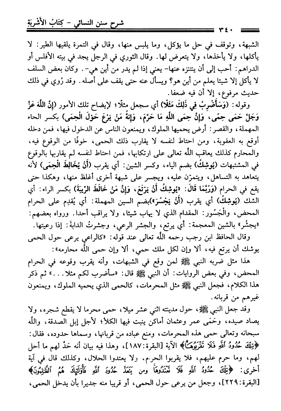 وَقَدْ جعل النبيّ -صلى الله عليه وسلم-، حول مدينته اثني عشر ميلا، حمى محرما لا يقطع شجره، ولا يصاد صيده، وحَمَى عمر وعثمان أماكن ينبت فيها الكلأ؛ لأجل إبل الصدقة، والله سبحانه وتعالى حمى هذه المحرمات، ومنع عباده منْ قربانها، وسماها حدوده، فَقَالَ: {تِلْكَ حُدُودُ اللَّهِ فَلَا تَقْرَبُوهَا} الآية [البقرة: 187]، وهذا فيه بيان أنه حَدَّ لهم ما أحل لهم، وما حرم عليهم، فلا يقربوا الحرام، ولا يعتدوا الحلال، وكذلك قَالَ فِي آية أخرى: {تِلْكَ حُدُودُ اللَّهِ فَلَا تَعْتَدُوهَا وَمَنْ يَتَعَدَّ حُدُودَ اللَّهِ فَأُولَئِكَ هُمُ الظَّالِمُونَ} [البقرة: 229]، وجعل منْ يرعى حول الحمى، أو قريبا منه جديرا بأن يدخل الحمى،