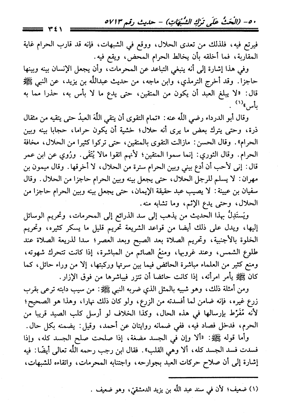 وَقَالَ أبو الدرداء رضي الله عنه: "تمام التقوى أن يتقي اللهَ العبدُ حَتَّى يتقيه منْ مثقال ذرة، وحتى يترك بعض ما يرى أنه حلال؛ خشية أن يكون حراما، حجابا بينه وبين الحرام". وَقَالَ الحسن: مازالت التقوى بالمتقين، حَتَّى تركوا كثيرا منْ الحلال، مخافة الحرام. وَقَالَ الثوري: إنما سموا المتقين؛ لأنهم اتقوا مالاً يُتّقَى. ورُوي عن ابن عمر قَالَ: إنى لأحب أن أدع بيني وبين الحرام سترة منْ الحلال، لا أخرقها. وَقَالَ ميمون بن مهران: لا يسلم للرجل الحلال، حَتَّى يجعل بينه وبين الحرام حاجزا منْ الحلال. وَقَالَ سفيان بن عيينة: لا يصيب عبد حقيقة الإيمان، حَتَّى يجعل بينه وبين الحرام حاجزا منْ الحلال، وحتى يدع الإثم، وما تشابه منه.