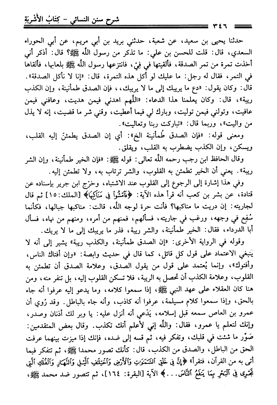 وفي هَذَا إشارة إلى الرجوع إلى القلوب عند الاشتباه، وخرّج ابن جرير بإسناده عن قتادة، عن بشر بن كعب أنه قرأ هذه الآية: {فَامْشُوا فِي مَنَاكِبِهَا} [الملك: 15] ثم قَالَ لجاريته: إن دريت ما مناكبها؟ فأنت حرة لوجه الله، قالت: مناكبها جبالها، فكأنما سُفِع فِي وجهه، ورغب فِي جاريته، فسألهم، فمنهم منْ أمره، ومنهم منْ نهاه، فسأل أبا الدرداء، فَقَالَ: الخير طمأنينة، والشر ريبة، فذر ما يريبك إلى ما لا يريبك.