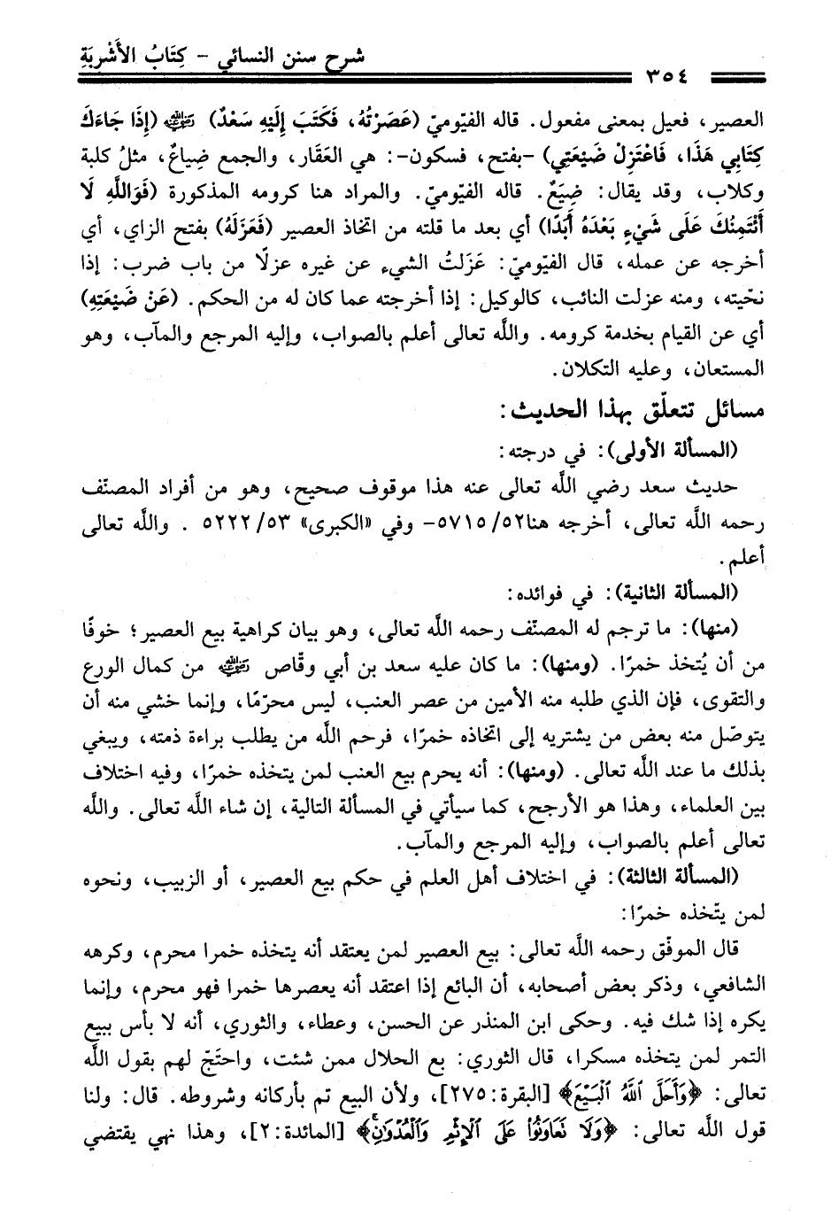 (منها): ما ترجم له المصنّف رحمه الله تعالى، وهو بيان كراهية بيع العصير؛ خوفًا منْ أن يُتخذ خمرًا. (ومنها): ما كَانَ عليه سعد بن أبي وقّاص -رضي الله عنه- منْ كمال الورع والتقوى، فإن الذي طلبه منه الأمين منْ عصر العنب، ليس محرّمًا، وإنما خشي منه أن يتوصّل منه بعض منْ يشتريه إلى اتخاذه خمرًا، فرحم الله منْ يطلب براءة ذمته، ويبغي بذلك ما عند الله تعالى. (ومنها): أنه يحرم بيع العنب لمن يتخذه خمرًا، وفيه اختلاف بين العلماء، وهذا هو الأرجح، كما سيأتي فِي المسألة التالية، إن شاء الله تعالى. والله تعالى أعلم بالصواب، وإليه المرجع والمآب.
