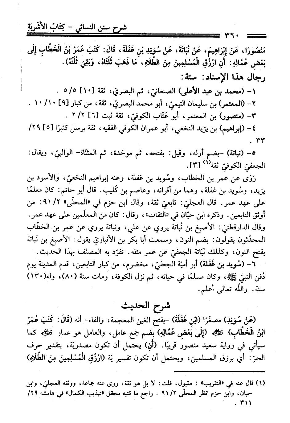 مَنْصُورًا، عَنْ إِبْرَاهِيمَ، عَنْ نُبَاتَةَ، عَنْ سُوَيْدِ بْنِ غَفَلَةَ، قَالَ: كَتَبَ عُمَرُ بْنُ الْخَطَّابِ إِلَى بَعْضِ عُمَّالِهِ: أَنِ ارْزُقِ الْمُسْلِمِينَ مِنَ الطِّلاَءِ، مَا ذَهَبَ ثُلُثَاهُ، وَبَقِيَ ثُلُثُهُ).