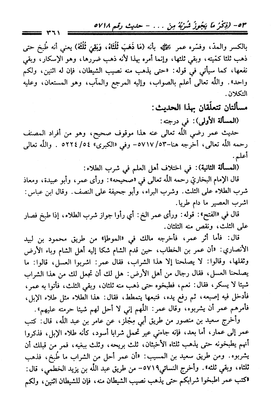 وأخرج سعيد بن منصور منْ طريق أبي مِجْلز، عن عامر بن عبد الله، قَالَ: كتب عمر إلى عمار، أما بعد، فإنه جاءني عير تحمل شرابا أسود، كأنه طلاء الإبل، فذكروا أنهم يطبخونه حَتَّى يذهب ثلثاه الأخبثان، ثلث بريحه، وثلث ببغيه، فمر منْ قبلك أن يشربوه. ومن طريق سعيد بن المسيب: "أن عمر أحل منْ الشراب ما طُبخ، فذهب ثلثاه، وبقى ثلثه". وأخرج النسائيّ 5719 - منْ طريق عبد الله بن يزيد الخطمي، قَالَ: "كتب عمر اطبخوا شرابكم حَتَّى يذهب نصيب الشيطان منه، فإن للشيطان اثنين، ولكم