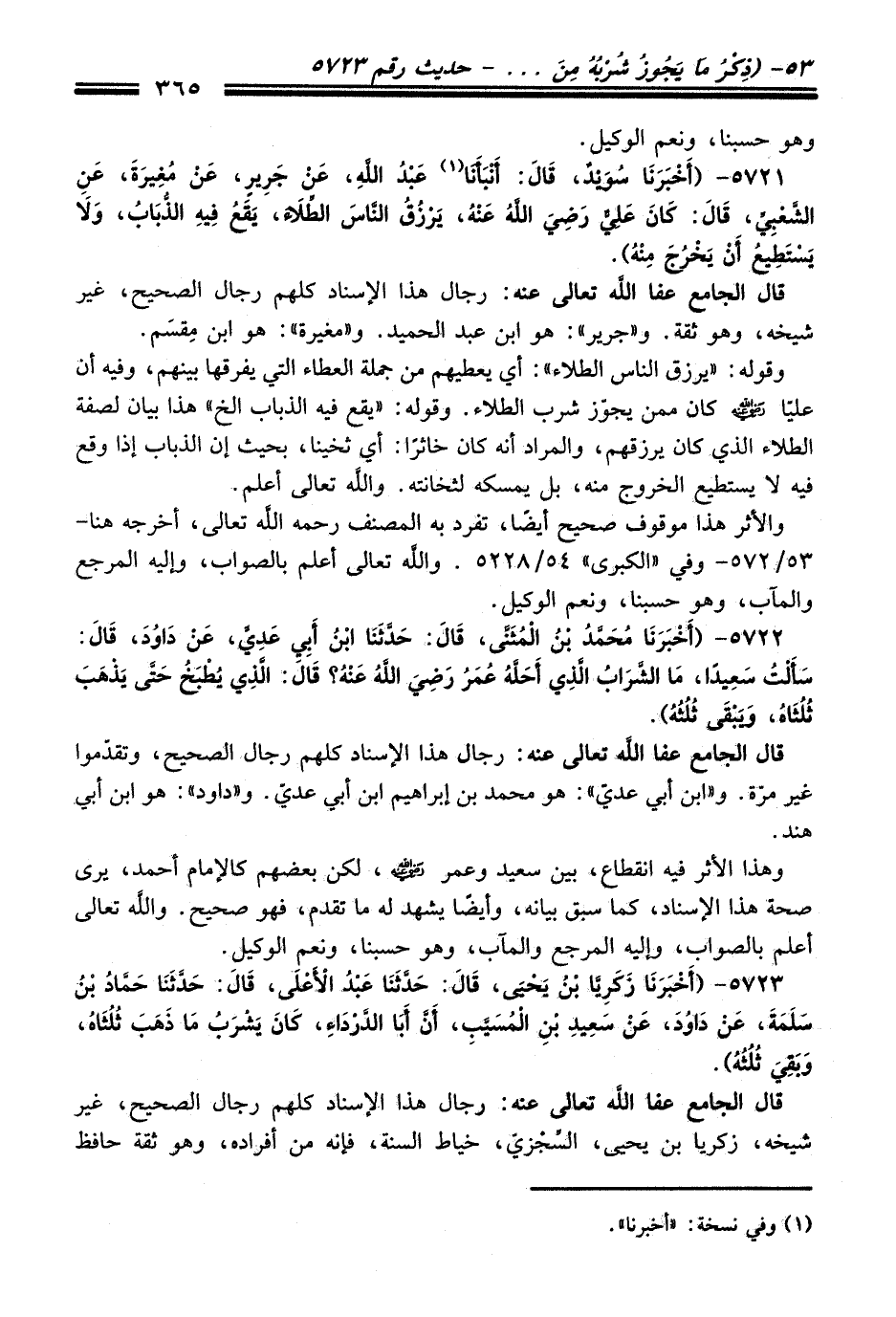 5721 - (أَخْبَرَنَا سُوَيْدٌ، قَالَ: أَنْبَأَنَا (¬1) عَبْدُ اللَّهِ، عَنْ جَرِيرٍ، عَنْ مُغِيرَةَ، عَنِ الشَّعْبِيِّ، قَالَ: كَانَ عَلِيٌّ رضى الله عنه، يَرْزُقُ النَّاسَ الطِّلاَءَ، يَقَعُ فِيهِ الذُّبَابُ، وَلاَ يَسْتَطِيعُ أَنْ يُخْرَجَ مِنْهُ).