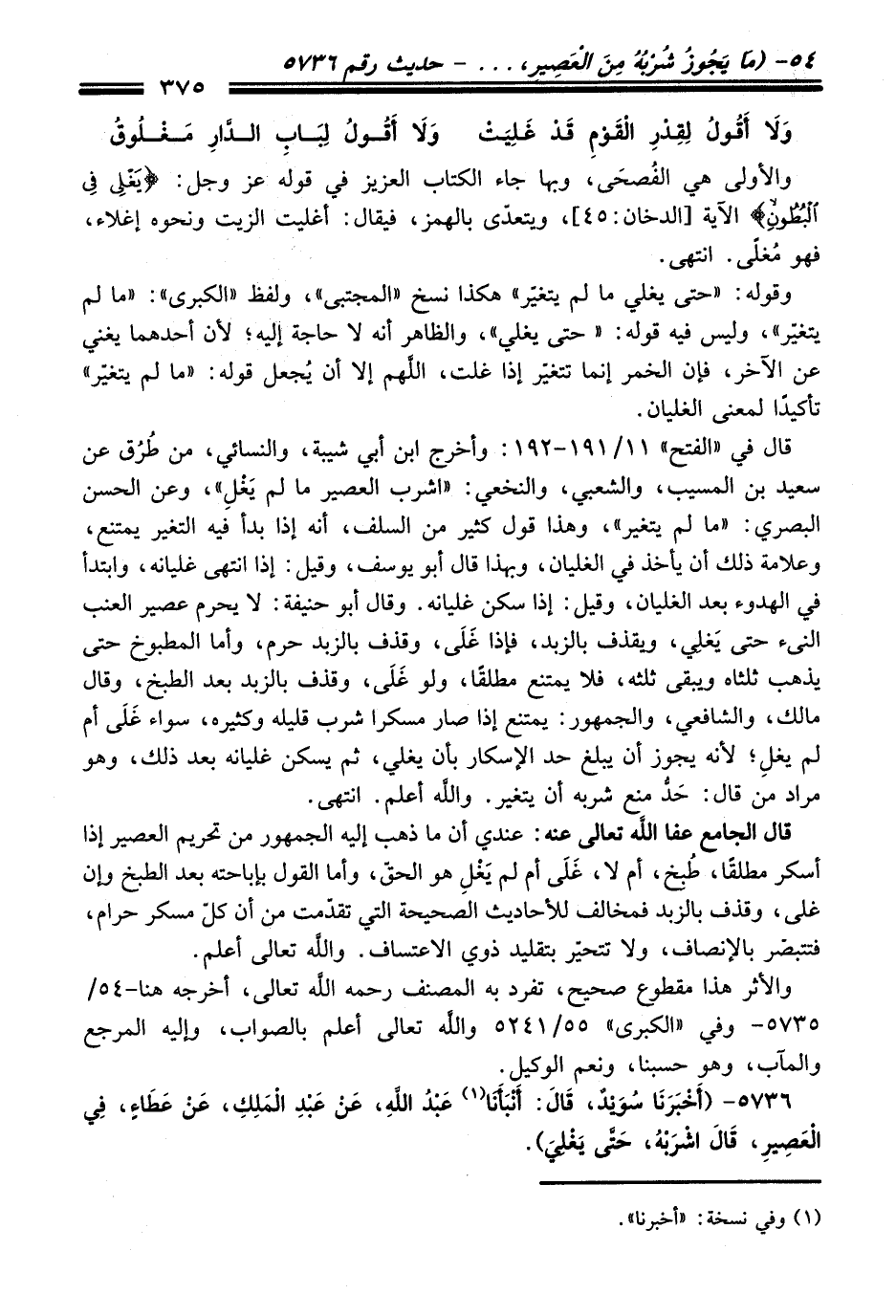 5736 - (أَخْبَرَنَا سُوَيْدٌ، قَالَ: أَنْبَأَنَا (¬1) عَبْدُ اللَّهِ، عَنْ عَبْدِ الْمَلِكِ، عَنْ عَطَاءٍ، فِى الْعَصِيرِ، قَالَ اشْرَبْهُ، حَتَّى يَغْلِيَ).