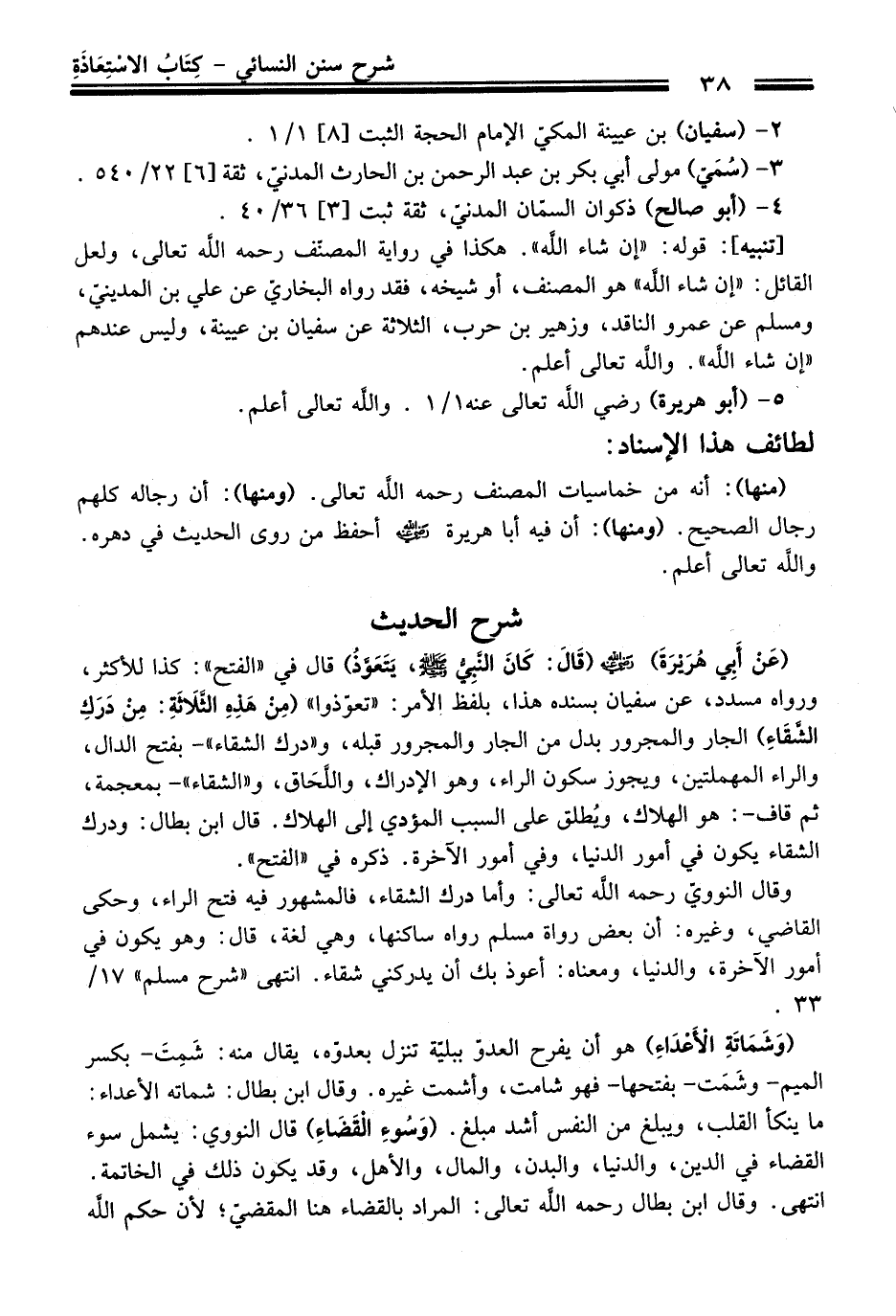 (عَنْ أَبِي هُرَيْرَةَ) -رضي الله عنه- (قَالَ: كَانَ النَّبِيُّ -صلى الله عليه وسلم-، يَتَعَوَّذُ) قَالَ فِي "الفتح": كذا للأكثر، ورواه مسدد، عن سفيان بسنده هَذَا، بلفظ الأمر: "تعوّذوا" (مِنْ هَذِهِ الثلَاثَةِ: مِنْ دَرَكِ الشَّقَاءِ) الجار والمجرور بدل منْ الجار والمجرور قبله، و"درك الشقاء" -بفتح الدال، والراء المهملتين، ويجوز سكون الراء، وهو الإدراك، واللَّحَاق، و"الشقاء" -بمعجمة، ثم قاف-: هو الهلاك، وُيطلق عَلَى السبب المؤدي إلى الهلاك. قَالَ ابن بطال: ودرك الشقاء يكون فِي أمور الدنيا، وفي أمور الآخرة. ذكره فِي "الفتح".
