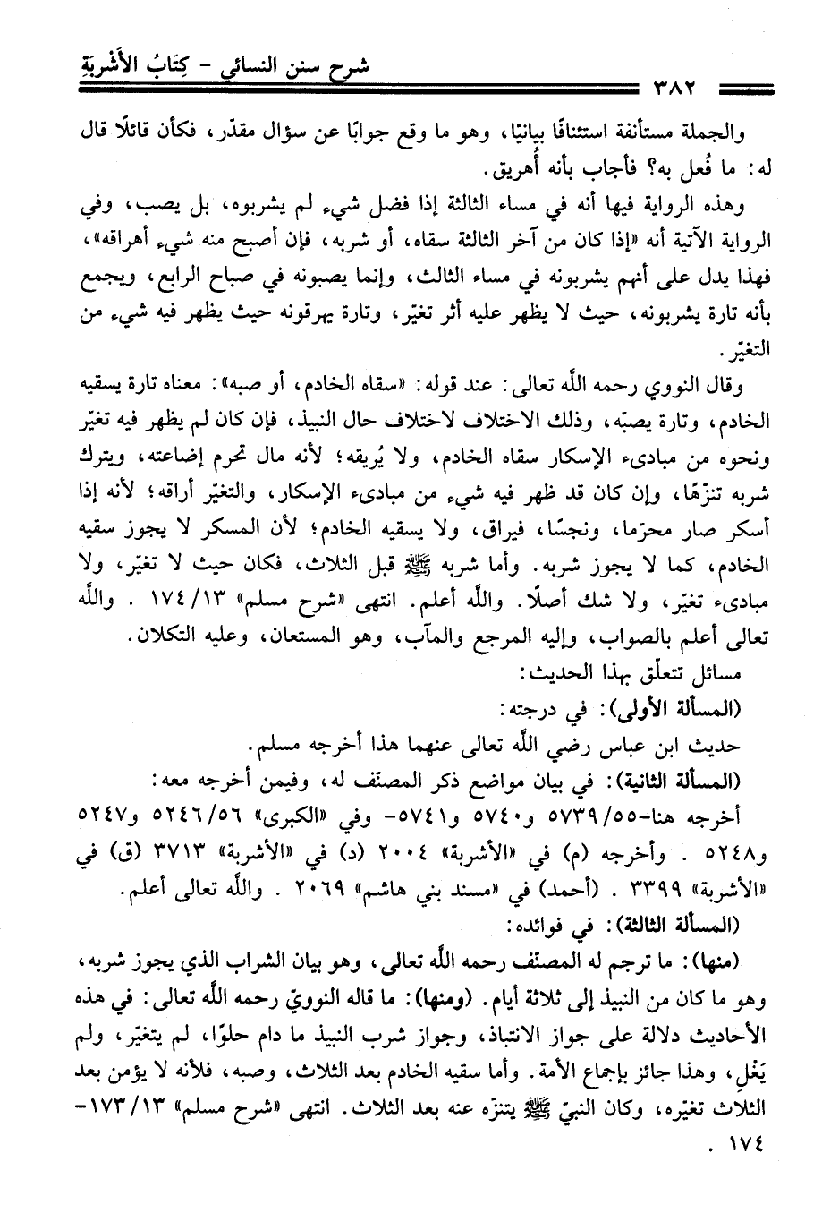 وَقَالَ النوويّ رحمه الله تعالى: عند قوله: "سقاه الخادم، أو صبه": معناه تارة يسقيه الخادم، وتارة يصبّه، وذلك الاختلاف لاختلاف حال النبيذ، فإن كَانَ لم يظهر فيه تغيّر ونحوه منْ مبادىء الإسكار سقاه الخادم، ولا يُريقه؛ لأنه مال تحرم إضاعته، ويترك شربه تنزّهًا، وإن كَانَ قد ظهر فيه شيء منْ مبادىء الإسكار، والتغيّر أراقه؛ لأنه إذا أسكر صار محرّما، ونجسًا، فيراق، ولا يسقيه الخادم؛ لأن المسكر لا يجوز سقيه الخادم، كما لا يجوز شربه. وأما شربه -صلى الله عليه وسلم- قبل الثلاث، فكان حيث لا تغيّر، ولا مبادىء تغيّر، ولا شك أصلًا. والله أعلم. انتهى "شرح مسلم" 13/ 174. والله تعالى أعلم بالصواب، وإليه المرجع والمآب، وهو المستعان، وعليه التكلان.