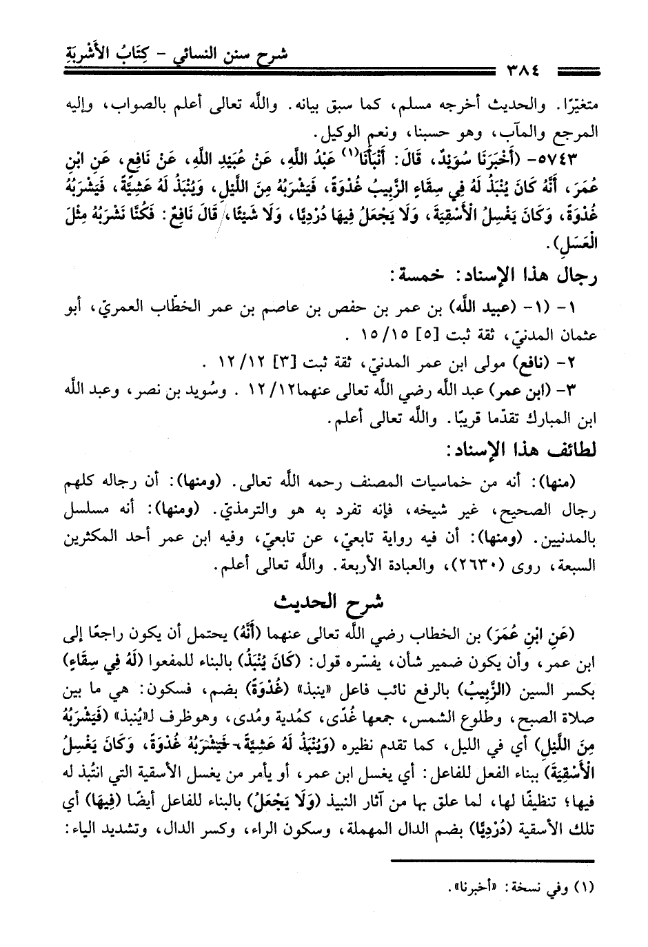 5743 - (أَخْبَرَنَا سُوَيْدٌ، قَالَ: أَنْبَأَنَا (¬1) عَبْدُ اللَّهِ، عَنْ عُبَيْدِ اللَّهِ، عَنْ نَافِعٍ، عَنِ ابْنِ عُمَرَ، أَنَّهُ كَانَ يُنْبَذُ لَهُ فِي سِقَاءِ الزَّبِيبِ غُدْوَةً، فَيَشْرَبُهُ مِنَ اللَّيْلِ، وَيُنْبَذُ لَهُ عَشِيَّةً، فَيَشْرَبُهُ غُدْوَةً، وَكَانَ يَغْسِلُ الأَسْقِيَةَ، وَلاَ يَجْعَلُ فِيهَا دُرْدِيًّا، وَلاَ شَيْئًا، قَالَ نَافِعٌ: فَكُنَّا نَشْرَبُهُ مِثْلَ الْعَسَلِ).