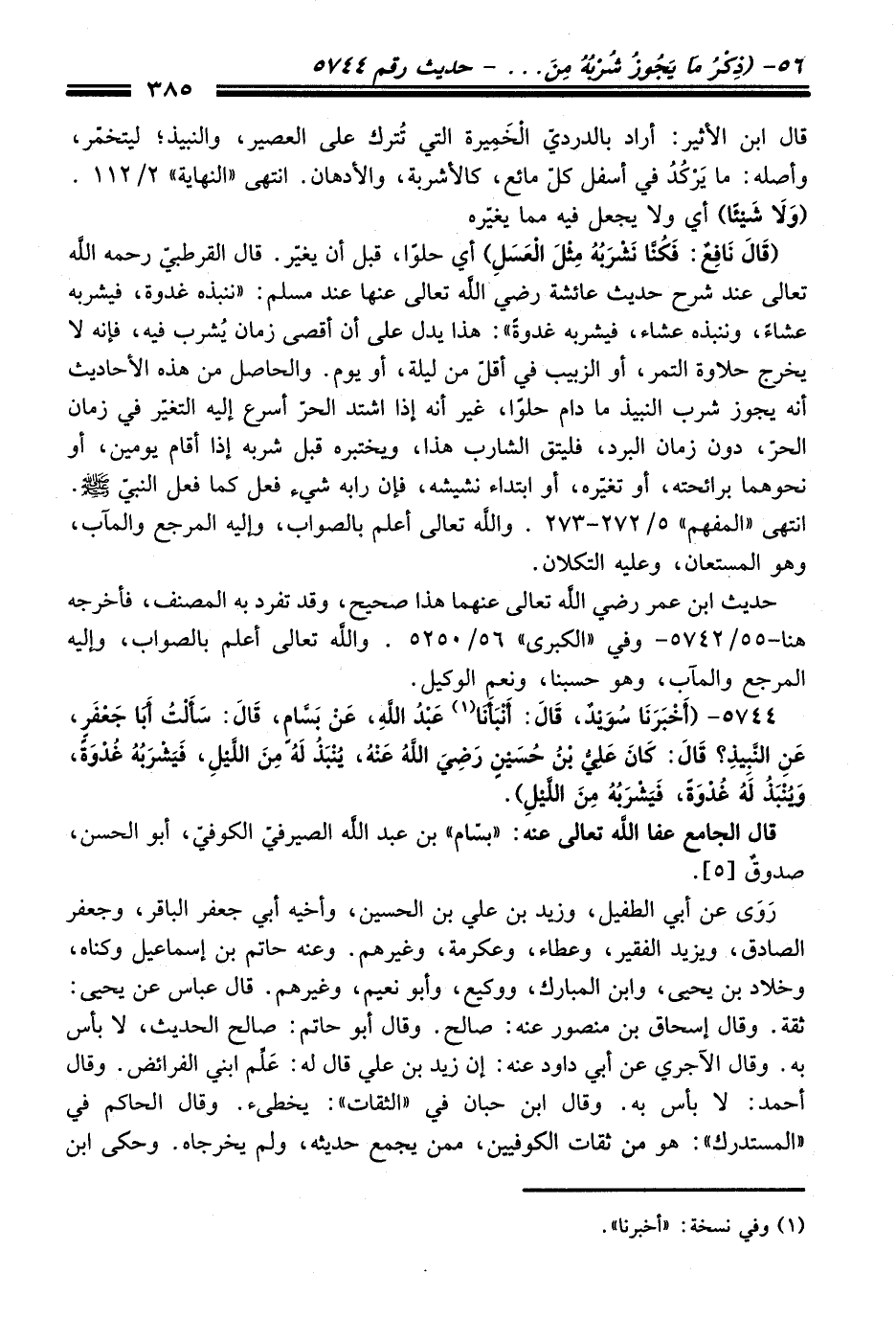 5744 - (أَخْبَرَنَا سُوَيْدٌ، قَالَ: أَنْبَأَنَا (¬1) عَبْدُ اللَّهِ، عَنْ بَسَّامٍ، قَالَ: سَأَلْتُ أَبَا جَعْفَرٍ، عَنِ النَّبِيذِ؟ قَالَ: كَانَ عَلِيُّ بْنُ حُسَيْنٍ رضى الله عنه، يُنْبَذُ لَهُ مِنَ اللَّيْلِ، فَيَشْرَبُهُ غُدْوَةً، وَيُنْبَذُ لَهُ غُدْوَةً، فَيَشْرَبُهُ مِنَ اللَّيْلِ).