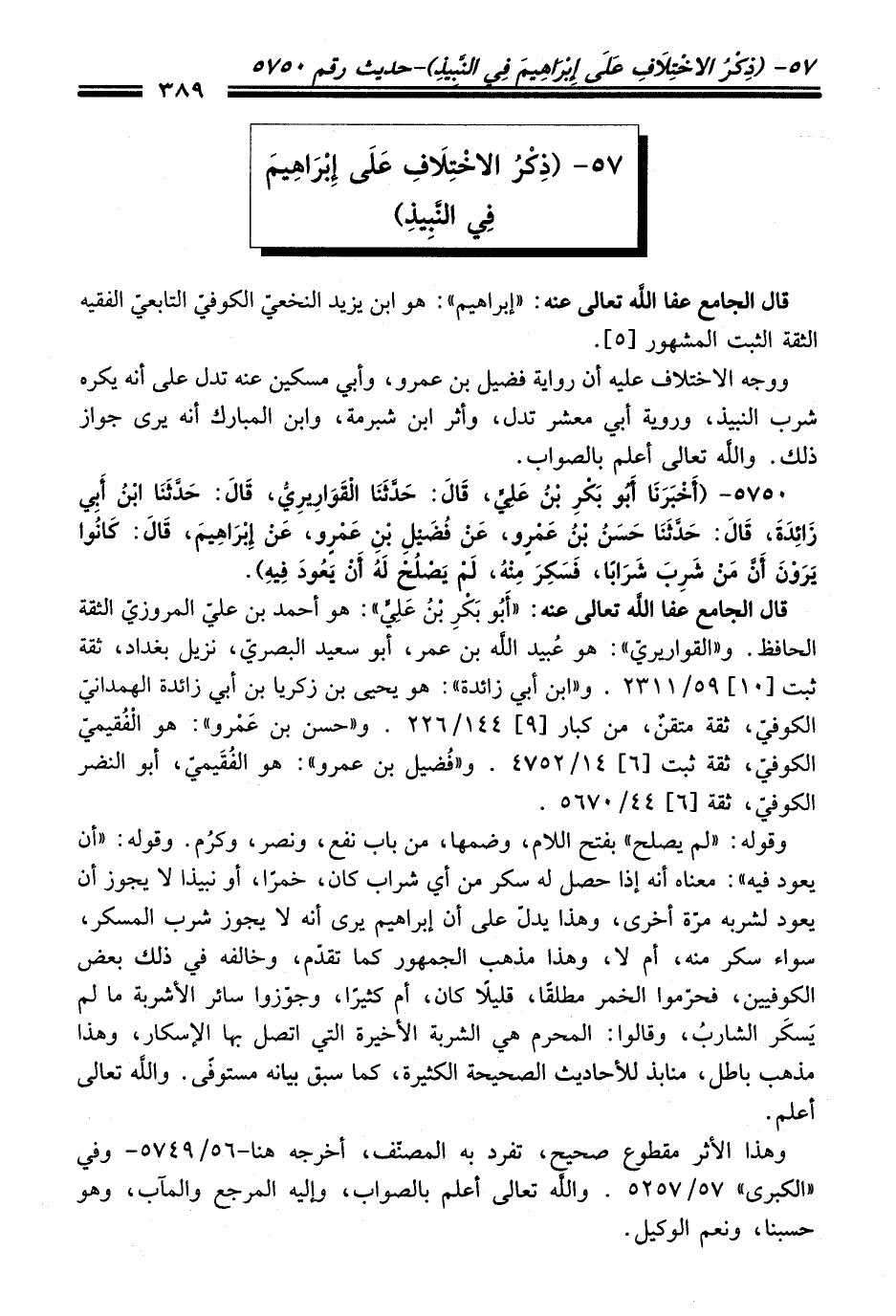 5750 - (أَخْبَرَنَا أَبُو بَكْرِ بْنُ عَلِيٍّ، قَالَ: حَدَّثَنَا الْقَوَارِيرِيُّ، قَالَ: حَدَّثَنَا ابْنُ أَبِي زَائِدَةَ، قَالَ: حَدَّثَنَا حَسَنُ بْنُ عَمْرٍو، عَنْ فُضَيْلِ بْنِ عَمْرٍو، عَنْ إِبْرَاهِيمَ، قَالَ: كَانُوا يَرَوْنَ أَنَّ مَنْ شَرِبَ شَرَابًا، فَسَكِرَ مِنْهُ، لَمْ يَصْلُحْ لَهُ أَنْ يَعُودَ فِيهِ).