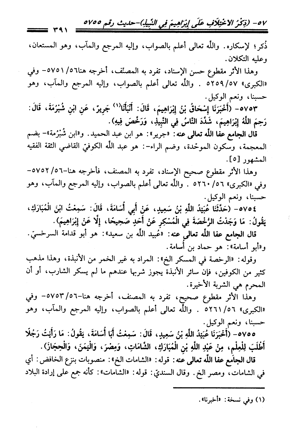 5753 - (أَخْبَرَنَا إِسْحَاقُ بْنُ إِبْرَاهِيمَ، قَالَ: أَنْبَأَنَا (¬1) جَرِيرٌ، عَنِ ابْنِ شُبْرُمَةَ، قَالَ: رَحِمَ اللَّهُ إِبْرَاهِيمَ، شَدَّدَ النَّاسُ فِي النَّبِيذِ، وَرَخَّصَ فِيهِ).