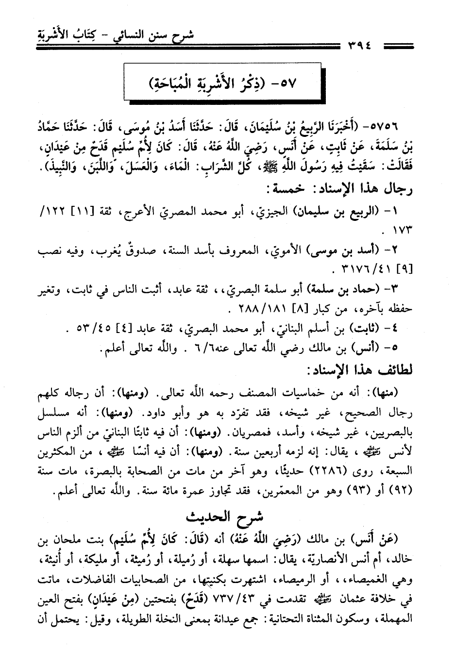 5756 - (أَخْبَرَنَا الرَّبِيعُ بْنُ سُلَيْمَانَ، قَالَ: حَدَّثَنَا أَسَدُ بْنُ مُوسَى، قَالَ: حَدَّثَنَا حَمَّادُ بْنُ سَلَمَةَ، عَنْ ثَابِتٍ، عَنْ أَنَسٍ، رضى الله عنه، قَالَ: كَانَ لأُمِّ سُلَيْمٍ قَدَحٌ مِنْ عَيْدَانٍ، فَقَالَتْ: سَقَيْتُ فِيهِ رَسُولَ اللَّهِ -صلى الله عليه وسلم-، كُلَّ الشَّرَابِ: الْمَاءَ، وَالْعَسَلَ، وَاللَّبَنَ، وَالنَّبِيذَ).