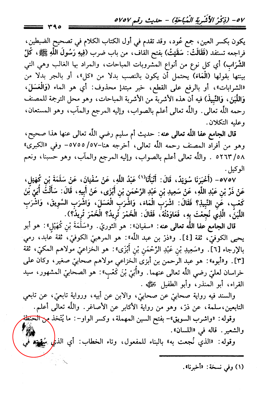 5757 - (أَخْبَرَنَا سُوَيْدٌ، قَالَ: أَنْبَأَنَا (¬1) عَبْدُ اللَّهِ، عَنْ سُفْيَانَ، عَنْ سَلَمَةَ بْنِ كُهَيْلٍ، عَنْ ذَرِّ بْنِ عَبْدِ اللَّهِ، عَنْ سَعِيدِ بْنِ عَبْدِ الرَّحْمَنِ بْنِ أَبْزَى، عَنْ أَبِيهِ، قَالَ: سَأَلْتُ أُبَيَّ بْنَ كَعْبٍ، عَنِ النَّبِيذِ؟ فَقَالَ: اشْرَبِ الْمَاءَ، وَاشْرَبِ الْعَسَلَ، وَاشْرَبِ السَّوِيقَ، وَاشْرَبِ اللَّبَنَ، الَّذِي نُجِعَتْ بِهِ، فَعَاوَدْتُهُ، فَقَالَ: الْخَمْرَ تُرِيدُ؟ الْخَمْرَ تُرِيدُ؟).