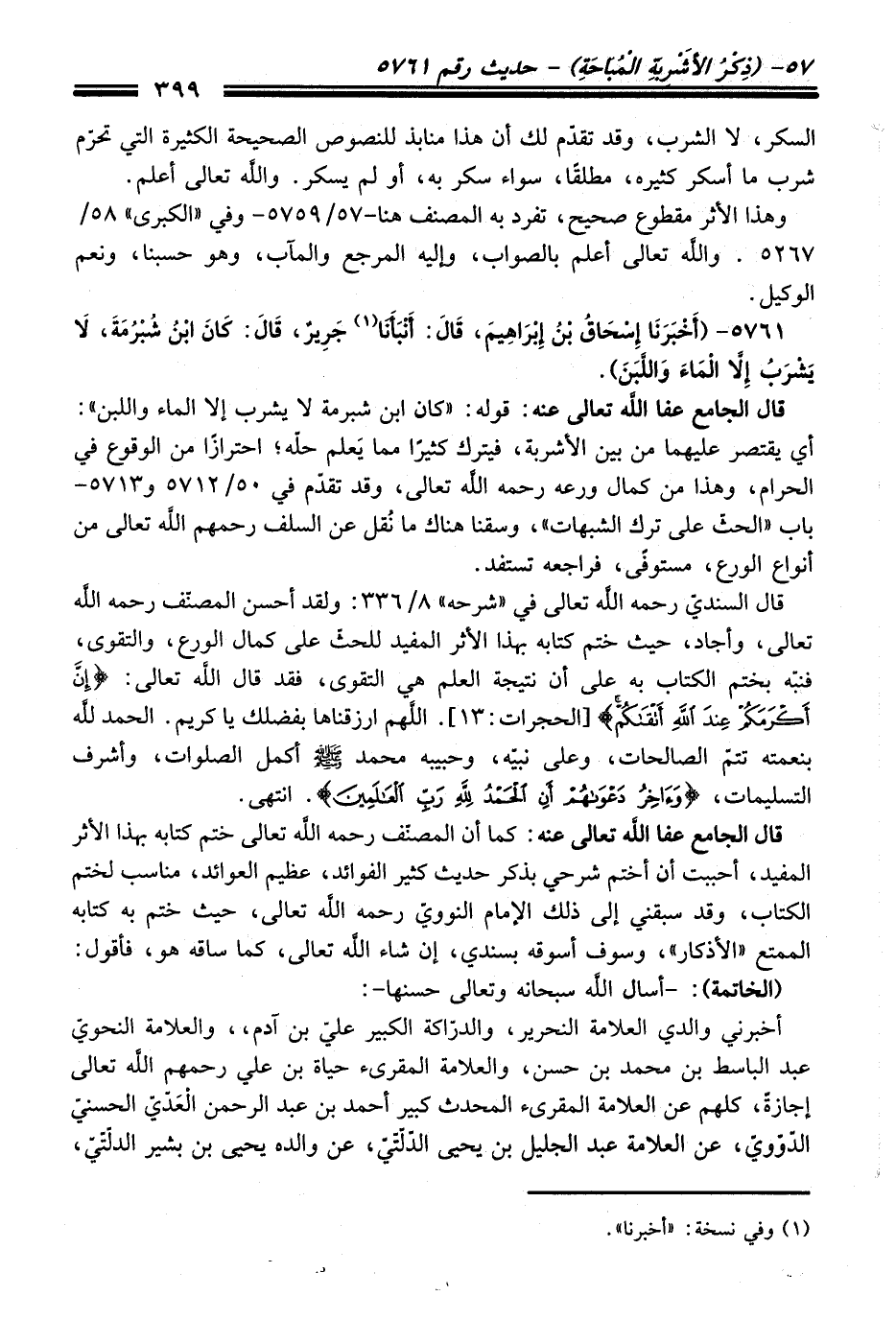 قَالَ السنديّ رحمه الله تعالى فِي "شرحه" 8/ 336: ولقد أحسن المصنّف رحمه الله تعالى، وأجاد، حيث ختم كتابه بهذا الأثر المفيد للحثّ عَلَى كمال الورع، والتقوى، فنبّه بختم الكتاب به عَلَى أن نتيجة العلم هي التقوى، فقد قَالَ الله تعالى: {إِنَّ أَكْرَمَكُمْ عِنْدَ اللَّهِ أَتْقَاكُمْ} [الحجرات: 13]. اللَّهم ارزقناها بفضلك يا كريم. الحمد لله بنعمته تتمّ الصالحات، وعلى نبيّه، وحبيبه محمد -صلى الله عليه وسلم- أكمل الصلوات، وأشرف التسليمات، {وَآخِرُ دَعْوَاهُمْ أَنِ الْحَمْدُ لِلَّهِ رَبِّ الْعَالَمِينَ}. انتهى.