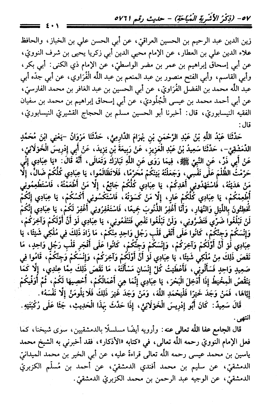 حَدَّثَنَا عَبْدُ اللهِ بْنُ عَبْدِ الرَّحْمَنِ بْنِ بَهْرَامَ الدَّرَامِيُّ، حَدَّثَنَا مَرْوَانُ -يَعْنِي ابْنَ مُحَمَّدٍ الدِّمَشْقِيَّ-، حَدَّثَنَا سَعِيدُ بْنُ عَبْدِ الْعَزِيزِ، عَنْ رَبِيعَةَ بْن يَزِيدَ، عَنْ أَبِي إِدْريسَ الْخَوْلانِيِّ، عَنْ أَبِي ذَرٍّ، عَنِ النَّبِيِّ -صلى الله عليه وسلم-، فِيمَا رَوَى عَنِ اللهِ تَبَارَكَ وَتَعَالَى، أَنَّه قَالَ: "يَا عِبَادِي إِنِّي حَرَّمْتُ الظُّلْمَ عَلَى نَفْسِي، وَجَعَلْتُهُ بَيْنَكُمْ مُحَرَّمًا، فَلَا تَظَالَمُوا، يَا عِبَادِي كُلُّكُمْ ضَالٌّ، إِلا مَنْ هَدَيْتُهُ، فَاسْتَهْدُونِي أَهْدِكُمْ، يَا عِبَادِي كُلُّكُمْ جَائِعٌ، إِلَّا مَنْ أَطْعَمْتُهُ، فَاسْتَطْعِمُونِي أَطْعِمْكُمْ، يَا عِبَادِي كُلُّكُمْ عَارٍ، إِلَّا مَنْ كَسَوْتُهُ، فَاسْتَكْسُونِي أَغْفِر لَكُمْ، يَا عِبَادِي إِنَّكُمْ تُخِطِئُّونَ بِاللَّيْلِ والنَّهَارِ، وَأَنَا أَغْفِر الذُّنُوبَ جَمِيعًا، فَاسْتَغْفِرونِي أَغْفِرْ لَكُمْ، يَا عِبَادِي إِنَّكُمْ لَنْ تَبْلِغُوا ضَرِّي فَتَضُرُّونِي، وَلَنْ تَبْلُغُوا نَفْعِي فَتَنْفَعُونِي، يَا عِبَادِي لَوْ أَنَّ أَوَّلَكُمْ وَآخِرَكُمْ، وَإِنْسَكُمْ وَجِنَّكُمْ، كَانُوا عَلَى أَتْقَى قَلْبِ رَجُلٍ وَاحِدٍ مِنْكُمْ، مَا زَادَ ذَلِكَ فِي مُلْكِي شَيْئًا، يَا عِبَادِي لَوْ أَنَّ أَوَّلَكُمْ وَآخِرَكُمْ، وَإِنْسَكُمْ وَجِنَّكُمْ، كَانُوا عَلَى أَفْجَرِ قَلْبِ رَجُلٍ وَاحِدٍ، مَا نَقَصَ ذَلِكَ مِنْ مُلْكِي شَيْئًا، يَا عِبَادِي لَوْ أَنَّ أَوَّلَكُمْ وَآخِرَكُمْ، وَإِنْسَكُمْ وَجِنَّكُمْ، قَامُوا فِي صَعِيدٍ وَاحِدٍ فَسَأَلُونِي، فَأَعْطَيْتُ كُلَّ إِنْسَانٍ مَسْأَلَتَهُ، مَا نَقَصَ ذَلِكَ مِمَّا عِنْدِي، إِلَّا كَمَا يَنْقُصُ الْمَخْيَطُ إِذَا أُدْخِل الْبَحْرَ، يَا عِبَادِي إِنَّمَا هِيَ أَعْمَالُكُمْ، أُحْصِيهَا لَكُمْ، ثُمَّ أُوَفِّيكُمْ إِيَّاهَا، فَمَنْ وَجَدَ خَيْرًا فَلْيَحْمَدِ اللهَ، وَمَنْ وَجَدَ غَيْرَ ذَلِكَ فَلا يَلُومَنَّ إِلَّا نَفْسَهُ".