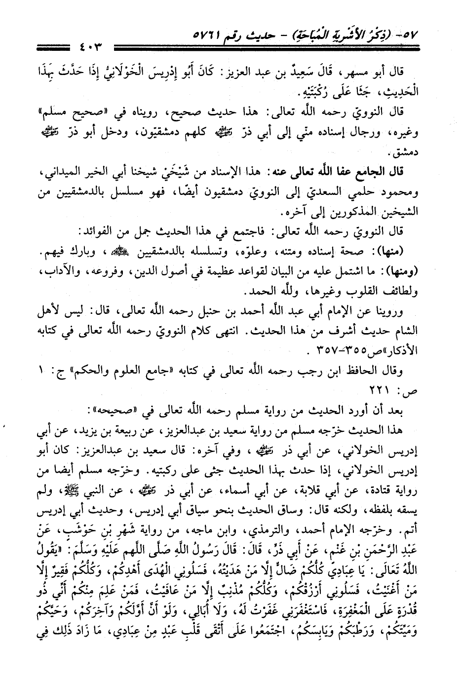 قَالَ النوويّ رحمه الله تعالى: هَذَا حديث صحيح، رويناه فِي "صحيح مسلم" وغيره، ورجال إسناده منّي إلى أبي ذرّ -رضي الله عنه- كلهم دمشقيّون، ودخل أبو ذرّ -رضي الله عنه- دمشق.
