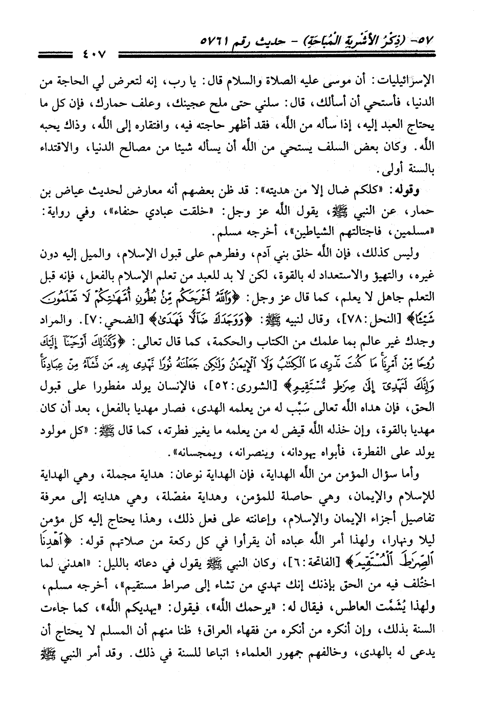 وليس كذلك، فإن الله خلق بني آدم، وفطرهم عَلَى قبول الإِسلام، والميل إليه دون غيره، والتهيؤ والاستعداد له بالقوة، لكن لابد للعبد منْ تعلم الإِسلام بالفعل، فإنه قبل التعلم جاهل لا يعلم، كما قَالَ عز وجل: {وَاللَّهُ أَخْرَجَكُمْ مِنْ بُطُونِ أُمَّهَاتِكُمْ لَا تَعْلَمُونَ شَيْئًا} [النحل: 78]، وَقَالَ لنبيه -صلى الله عليه وسلم-: {وَوَجَدَكَ ضَالًّا فَهَدَى} [الضحى: 7]. والمراد وجدك غير عالم بما علمك منْ الكتاب والحكمة، كما قَالَ تعالى: {وَكَذَلِكَ أَوْحَيْنَا إِلَيْكَ رُوحًا مِنْ أَمْرِنَا مَا كُنْتَ تَدْرِي مَا الْكِتَابُ وَلَا الْإِيمَانُ وَلَكِنْ جَعَلْنَاهُ نُورًا نَهْدِي بِهِ مَنْ نَشَاءُ مِنْ عِبَادِنَا وَإِنَّكَ لَتَهْدِي إِلَى صِرَاطٍ مُسْتَقِيمٍ} [الشورى: 52]، فالإنسان يولد مفطورا عَلَى قبول الحق، فإن هداه الله تعالى سَبَّب له منْ يعلمه الهدى، فصار مهديا بالفعل، بعد أن كَانَ مهديا بالقوة، وإن خذله الله قيض له منْ يعلمه ما يغير فطرته، كما قَالَ -صلى الله عليه وسلم-: "كل مولود يولد عَلَى الفطرة، فأبواه يهودانه، وينصرانه، ويمجسانه".