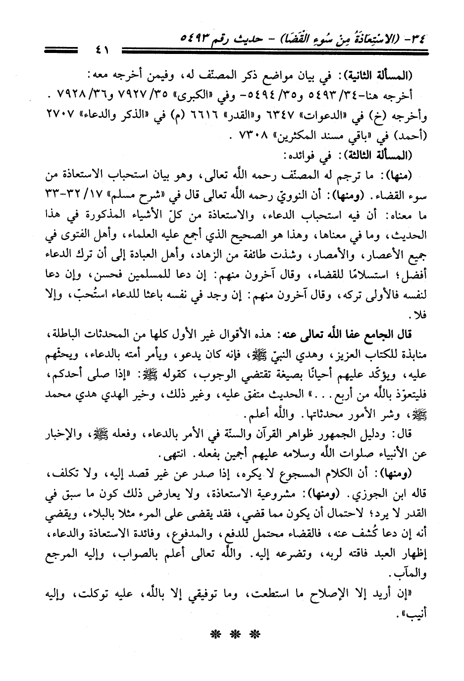 (ومنها): أن الكلام المسجوع لا يكره، إذا صدر عن غير قصد إليه، ولا تكلف، قاله ابن الجوزي. (ومنها): مشروعية الاستعاذة، ولا يعارض ذلك كون ما سبق فِي القدر لا يرد؛ لاحتمال أن يكون مما قضي، فقد يقضى عَلَى المرء مثلا بالبلاء، ويقضي أنه إن دعا كُشف عنه، فالقضاء محتمل للدفع، والمدفوع، وفائدة الاستعاذة والدعاء، إظهار العبد فاقته دربه، وتضرعه إليه. والله تعالى أعلم بالصواب، وإليه المرجع والمآب.