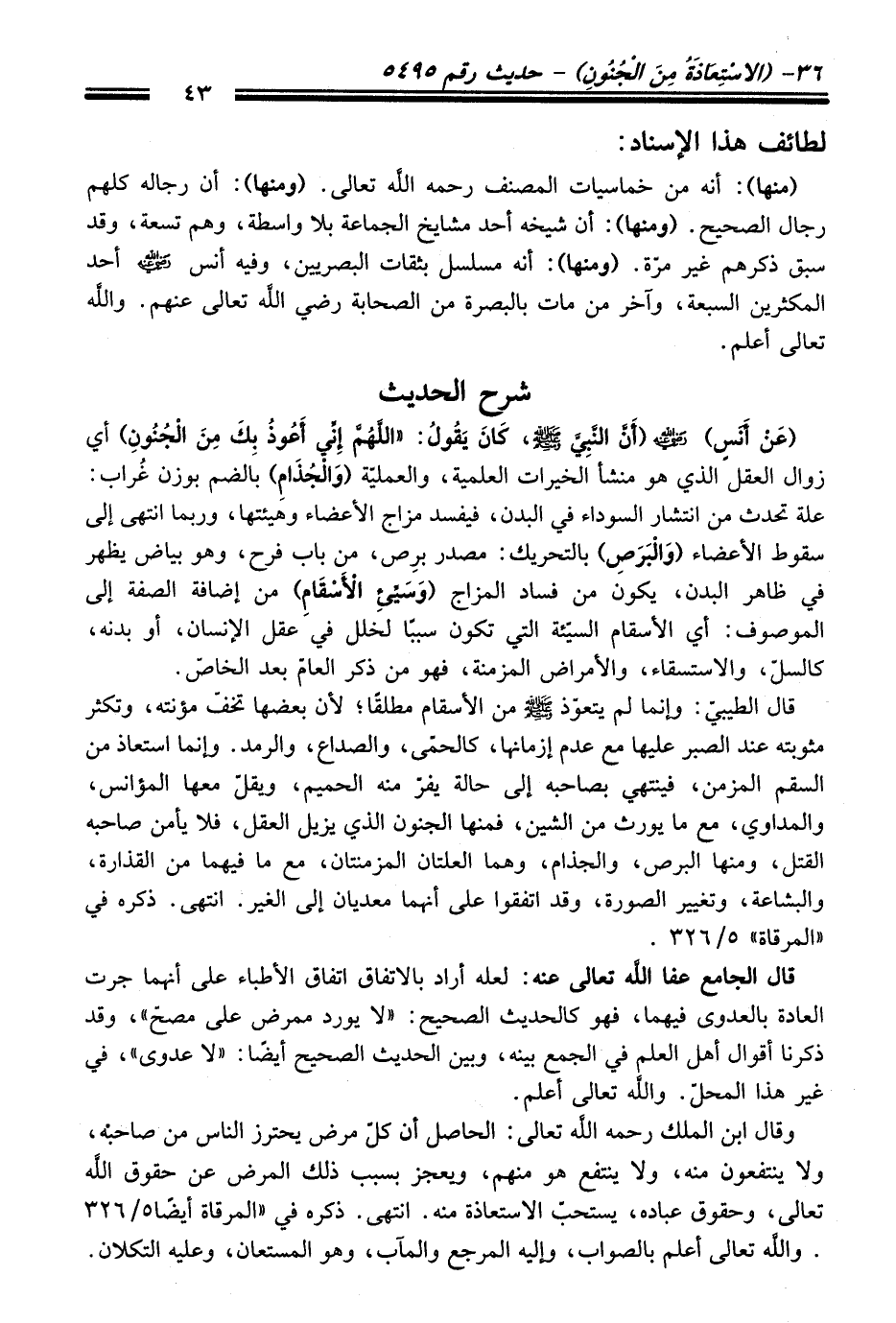 وَقَالَ ابن الملك رحمه الله تعالى: الحاصل أن كلّ مرض يحترز النَّاس منْ صاحّه، ولا ينتفعون منه، ولا ينتفع هو منهم، ويعجز بسبب ذلك المرض عن حقوق الله تعالى، وحقوق عباده، يستحبّ الاستعاذة منه. انتهى. ذكره فِي "المرقاة" أيضًا 5/ 326. والله تعالى أعلم بالصواب، وإليه المرجع والمآب، وهو المستعان، وعليه التكلان.