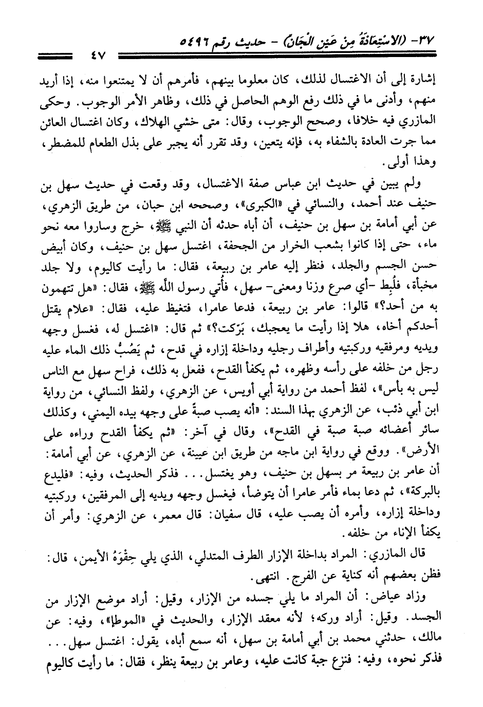 ولم يبين فِي حديث ابن عبّاس صفة الاغتسال، وَقَدْ وقعت فِي حديث سهل بن حنيف عند أحمد، والنسائي فِي "الكبرى"، وصححه ابن حبّان، منْ طريق الزهريّ، عن أبي أمامة بن سهل بن حنيف، أن أباه حدثه أن النبيّ -صلى الله عليه وسلم-، خرج وساروا معه نحو ماء، حَتَّى إذا كانوا بشعب الخرار منْ الجحفة، اغتسل سهل بن حنيف، وكان أبيض حسن الجسم والجلد، فنظر إليه عامر بن ربيعة، فَقَالَ: ما رأيت كاليوم، ولا جلد مخبأة، فلُبِط -أي صرع وزنا ومعنى- سهل، فأُتي رسول الله -صلى الله عليه وسلم-، فَقَالَ: "هل تتهمون به منْ أحد؟ " قالوا: عامر بن ربيعة، فدعا عامرا، فتغيظ عليه، فَقَالَ: "علام يقتل أحدكم اْخاه، هلا إذا رأيت ما يعجبك، بَرّكت؟ " ثم قَالَ: "اغتسل له، فغسل وجهه ويديه ومرفقيه وركبتيه وأطراف رجليه وداخلة إزاره فِي قدح، ثم يَصُبُّ ذلك الماء عليه رجل منْ خلفه عَلَى رأسه وظهره، ثم يكفأ القدح، ففعل به ذلك، فراح سهل مع النَّاس ليس به بأس"، لفظ أحمد منْ رواية أبي أويس، عن الزهريّ، ولفظ النسائيّ، منْ رواية ابن أبي ذئب، عن الزهريّ بهذا السند: "أنه يصب صبةً عَلَى وجهه بيده اليمني، وكذلك سائر أعضائه صبة صبة فِي القدح"، وَقَالَ فِي آخر: "ثم يكفأ القدح وراءه عَلَى الأرض". ووقع فِي رواية ابن ماجه منْ طريق ابن عيينة، عن الزهريّ، عن أبي أمامة: أن عامر بن ربيعة مر بسهل بن حنيف، وهو يغتسل ... فذكر الْحَدِيث، وفيه: "فليدع بالبركة"، ثم دعا بماء فأمر عامرا أن يتوضأ، فيغسل وجهه ويديه إلى المرفقين، وركبتيه وداخلة إزاره، وأمره أن يصب عليه، قَالَ سفيان: قَالَ معمر، عن الزهريّ: وأمر أن يكفأ الإناء منْ خلفه.