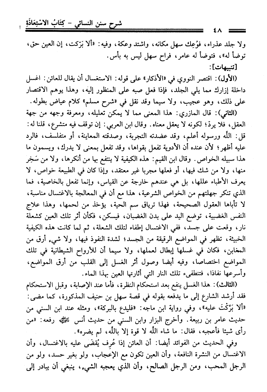 (الأول): اقتصر النوويّ فِي "الأذكار" عَلَى قوله: الاستغسال أن يقال للعائن: اغسل داخلة إزارك مما يلي الجلد، فإذا فعل صبه عَلَى المنظور إليه، وهذا يوهم الاقتصار عَلَى ذلك، وهو عجيب، ولاسيما وَقَدْ نقل فِي "شرح مسلم" كلام عياض بطوله.