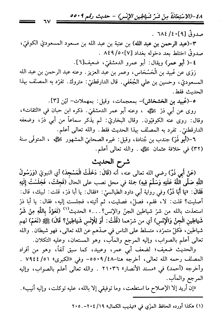 (عَنْ أَبِي ذَرّ) رضي الله تعالى عنه، أنه (قَالَ: دَخَلْتُ الْمَسْجدَ) أي النبويّ (وَرَسُولُ اللهِ صَلَّى اللهُ عَلَيهِ وَسَلَّمَ فِيهِ) جملة فِي محل نصب عَلَى الحالَ (فَجئْتُ، فَجَلَسْتُ إِلَيهِ فَقَالَ: "يَا أَبَا ذَرٍّ) وفي رواية أبي داود الطيالسيّ: "فَقَالَ: يا أبا ذرّ، قلت: لبيك، قَالَ: أصليت؟ قلت: لا، فقم، فصلّ، فصليت، ثم أتيته، فجلست إليه، فَقَالَ: يا أبا ذرّ استعذت بالله منْ شرّ شياطين الجنّ والإنس؟ ... " الْحَدِيث (¬1) (تَعَوَّذْ بِاللهِ مِنْ شَرِّ شَيَاطِينِ الْجنِّ وَالْإِنْسِ) أي منْ شرّهما (قُلْتُ: أَوَ لِلْإنْسِ شَيَاطِينُ؟ قَالَ) -صلى الله عليه وسلم- (نَعَمْ) لهم شياطين، فكلّ متمرّد، متسلط عَلَى النَّاس فِي صدّهم عن الله تعالى، فهو شيطان. والله تعالى أعلم بالصواب، وإليه المرجع والمآب، وهو المستعان، وعليه التكلان.