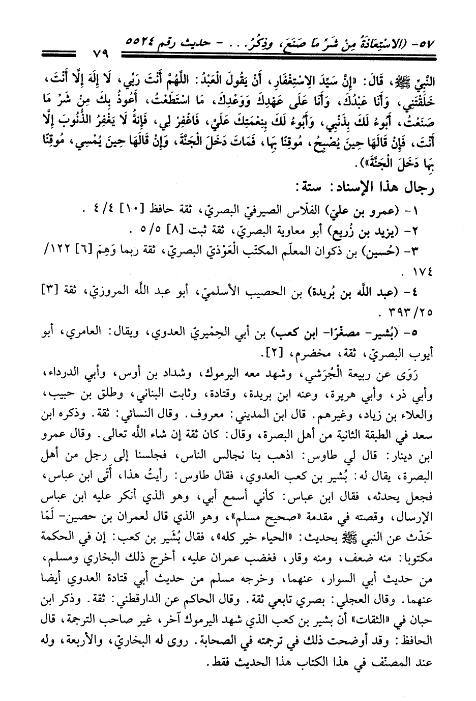 النَّبِيِّ -صلى الله عليه وسلم-، قَالَ: "إِنَّ سَيِّدَ الاِسْتِغْفَارِ، أَنْ يَقُولَ الْعَبْدُ: اللَّهُمَّ أَنْتَ رَبِّي، لاَ إِلَهَ إِلاَّ أَنْتَ، خَلَقْتَنِي وَأَنَا عَبْدُكَ، وَأَنَا عَلَى عَهْدِكَ وَوَعْدِكَ، مَا اسْتَطَعْتُ، أَعُوذُ بِكَ مِنْ شَرِّ مَا صَنَعْتُ، أَبُوءُ لَكَ بِذَنْبِي، وَأَبُوءُ لَكَ بِنِعْمَتِكَ عَلَيَّ، فَاغْفِرْ لِي، فَإِنَّهُ لاَ يَغْفِرُ الذُّنُوبَ إِلاَّ أَنْتَ، فَإِنْ قَالَهَا حِينَ يُصْبِحُ، مُوقِنًا بِهَا، فَمَاتَ دَخَلَ الْجَنَّةَ، وَإِنْ قَالَهَا حِينَ يُمْسِي، مُوقِنًا بِهَا دَخَلَ الْجَنَّةَ").