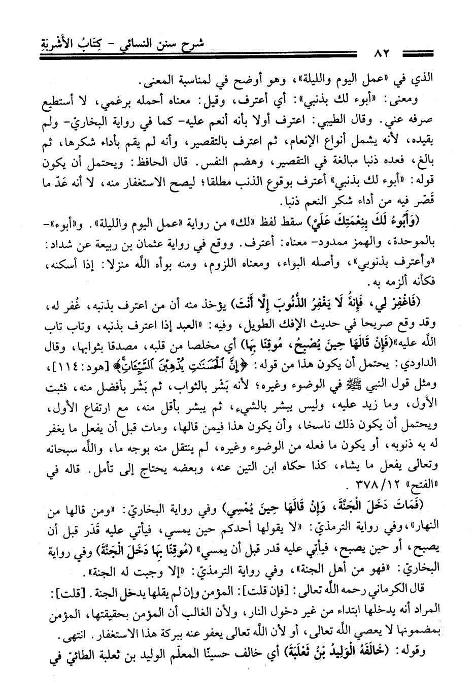 (وَأَبُوءُ لَكَ بنِعْمَتِكَ عَلَيَّ) سقط لفظ "لك" منْ رواية "عمل اليوم والليلة". و"أبوء" -بالموحدة، والهَمز ممدود- معناه: أعترف. ووقع فِي رواية عثمان بن ربيعة عن شداد: "وأعترف بذنوبي"، وأصله البواء، ومعناه اللزوم، ومنه بوأه الله منزلا: إذا أسكنه، فكأنه ألزمه به.