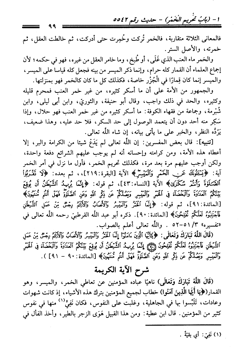 (قَالَ اللهُ تَبَارَكَ وَتَعَالَى: {يَا أَيُّهَا الَّذِينَ آمَنُوا إِنَّمَا الْخَمْرُ وَالْمَيْسِرُ وَالْأَنْصَابُ وَالْأَزْلَامُ رِجْسٌ مِنْ عَمَلِ الشَّيْطَانِ فَاجْتَنِبُوهُ لَعَلَّكُمْ تُفْلِحُونَ (90) إِنَّمَا يُرِيدُ الشَّيْطَانُ أَنْ يُوقِعَ بَيْنَكُمُ الْعَدَاوَةَ وَالْبَغْضَاءَ فِي الْخَمْرِ وَالْمَيْسِرِ وَيَصُدَّكُمْ عَنْ ذِكْرِ اللَّهِ وَعَنِ الصَّلَاةِ فَهَلْ أَنْتُمْ مُنْتَهُونَ (91)} [المائدة: 90، 91]).