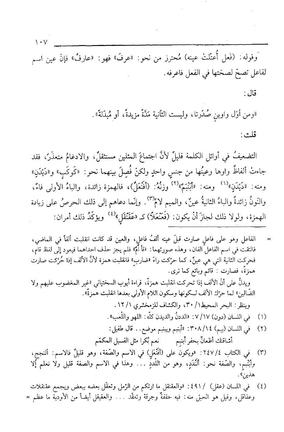 التضعيف في أوائل الكلمة قليل لأن اجتماع المثلين مستثقل، والادغام متعذر، فقد جاءت ألفاظ واوها وعينها من جنس واحد ولكن فصل بينهما نحو: "كوكب" و"ديدن" ومنه: "ديدن" ومنه: "أبنبم" وزنه: (أفنعل)، فالهمزة زائدة، والباء الأولى فاء، والنون زائدة والباء الثانية عين، والميم لام. وإنما دعاهم إلى ذلك الحرص على زيادة الهمزة، ولولا ذلك لجاز أن يكون: (فعنعلا) كـ"عقنقل" ويؤكد ذلك أمران: