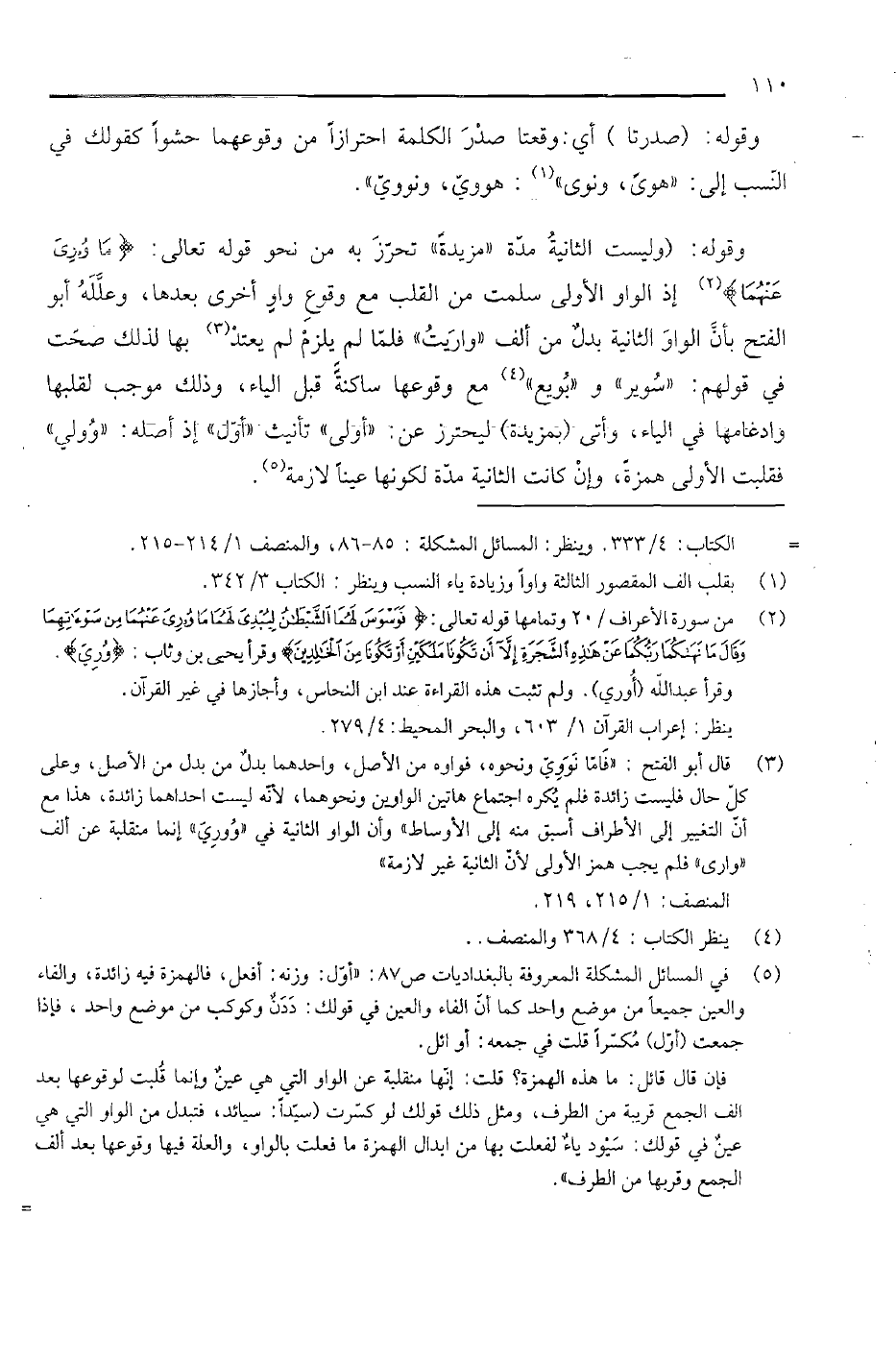وقوله: (وليست الثانية مدة "مزيدة" تحرز به من نحو قوله تعالى: {ما وزري عنهما} إذ الواو الأولى سلمت من القلب مع وقوع واو أخرى بعدها، وعلله أبو الفتح بأن الواو الثانية بدل من ألف "واريت" فلما لم يلزم لم يعتد بها لذلك صحت في قولهم: "سوير" و"بويع" مع وقوعها ساكنة قبل الياء، وذلك موجب لقلبها وادغامها في الياء، وأتي (بمزيدة) لحترز عن: "أولى" تأنيث "أول" إذ أصله: "وولي" فقلبت الأولى همزة، وإن كانت الثانية مدة لكونها عينا لازمة.