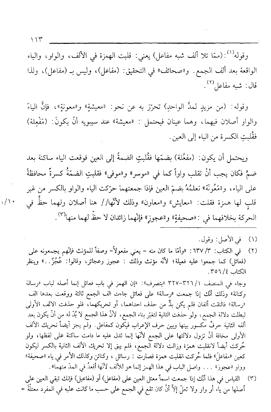ويحتمل أن يكون: (مفعلة) بضمها فقلبت الضمة إلى العين فوقعت الياء ساكنة بعد ضم فكان يجب أن تقلب واواً كما في"موسر" و"موفي" فقلبت الضمة كسرة محافظة على الياء، و"معونة" نعلمه بضم العين فإذا جمعتهما حركت الياء والواو بالكسر من غير قلب لها همزة فقلت: "معايش" و"معاون" وذلك لأنها// هنا أصلان ولهما حظ في الحركة بخلافهما في: "صحيفة" و"عجوز" فإنهما زائدان لا حظ لهما منها.