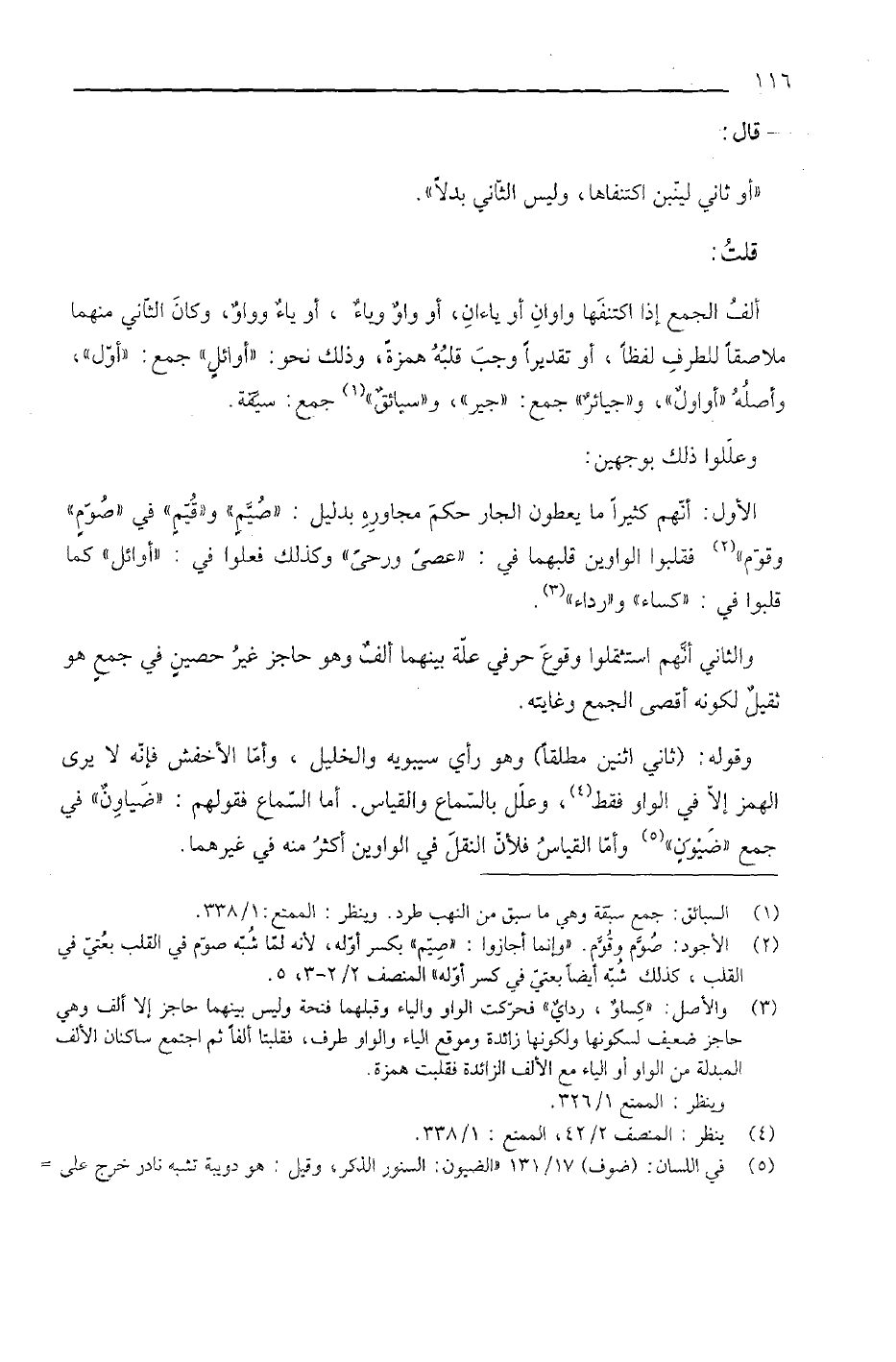 والثاني أنهم استثقلوا وقوع حرفي علة بينهما ألف وهو حاجز غير حصين في جمع هو ثقيل لكونه أقصى الجمع وغايته.