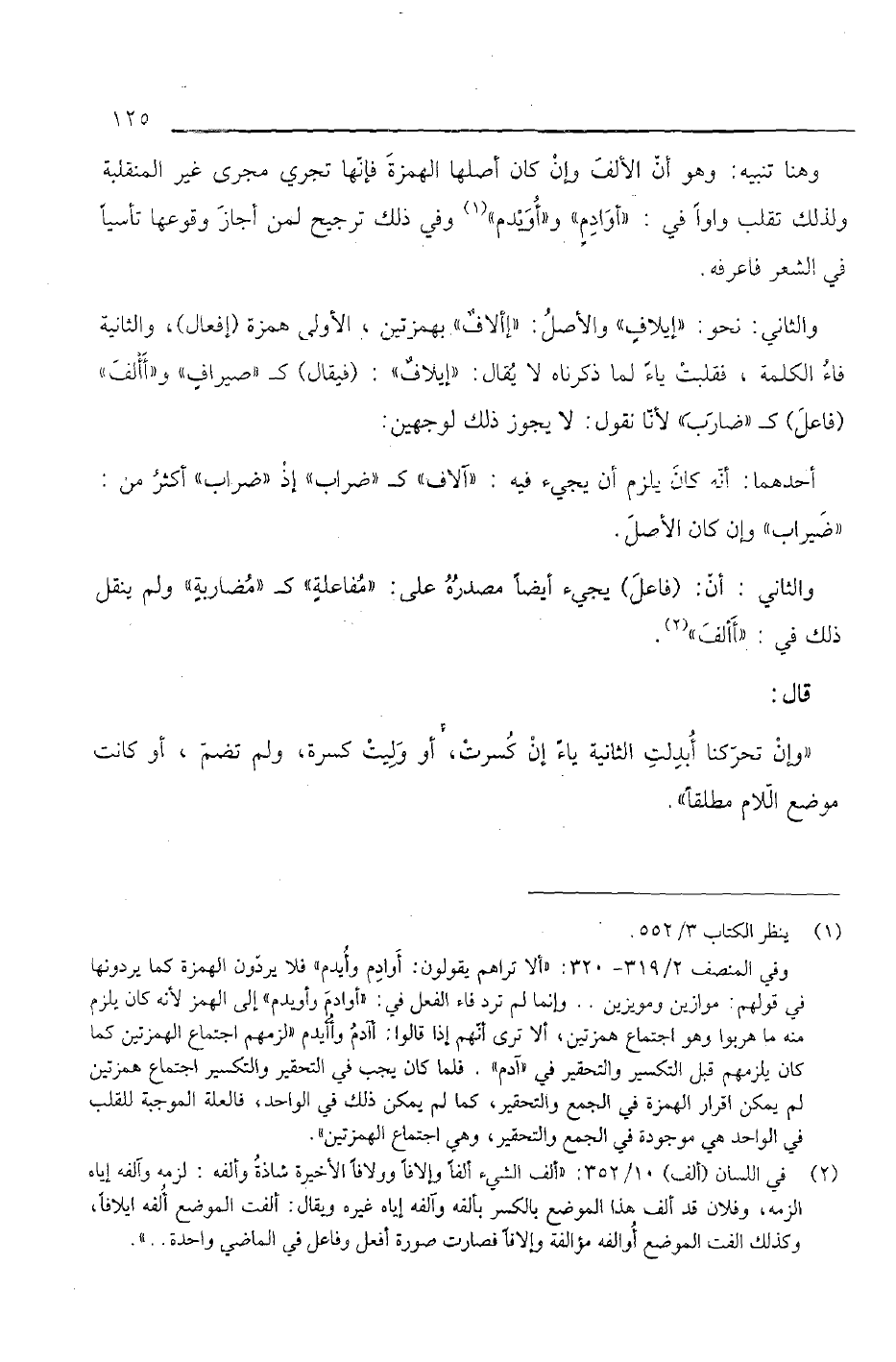 وهنا تنبيه: وهو أن الألف وإن كان أصلها الهمزة فإنها تجري مجرى غير المنقلبة ولذلك تقلب واواً في: "أوادم" و"أويدم" وفي ذلك ترجيح لمن أجاز وقوعها تأسيسا ً في الشعر فاعرفع.